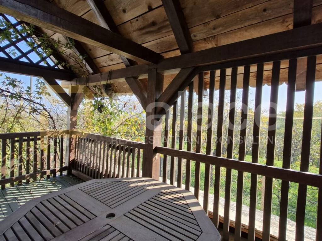 Dort befinden sich ein Weinberg und ein Garten mit einer überdachten Laube mit Blick auf die Donau und bereits angeschlossenem Strom.
