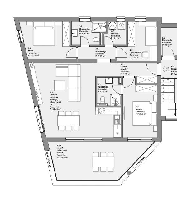 Die Wohnung mit einer Gesamtfläche von 101m2 besteht aus einem Wohnzimmer, das mit der Küche und dem Esszimmer in einem offenen Konzept von 34,43m2 verbunden ist, drei Schlafzimmern, zwei Badezimmern mit WC, einem Waschraum und einer überdachten Terrasse von 22m2.