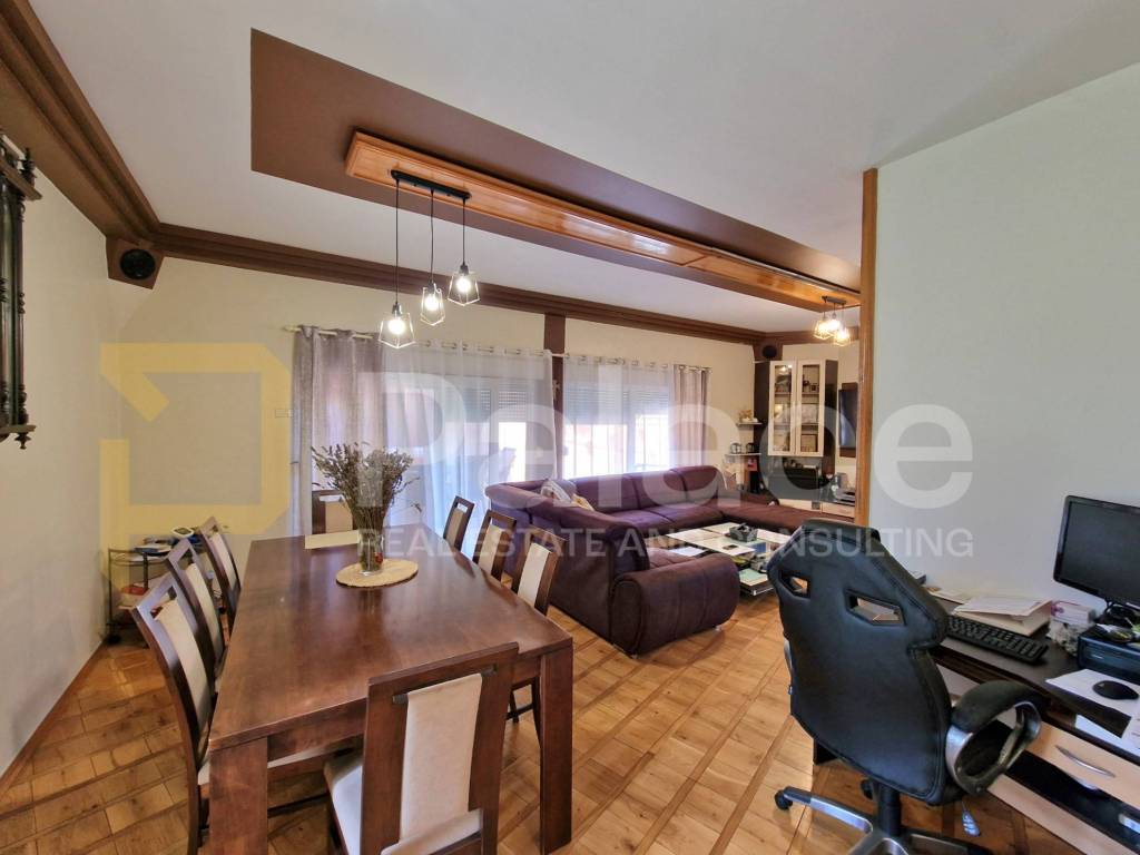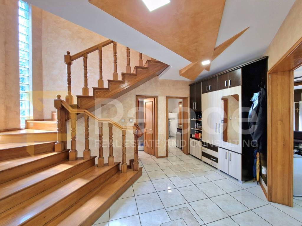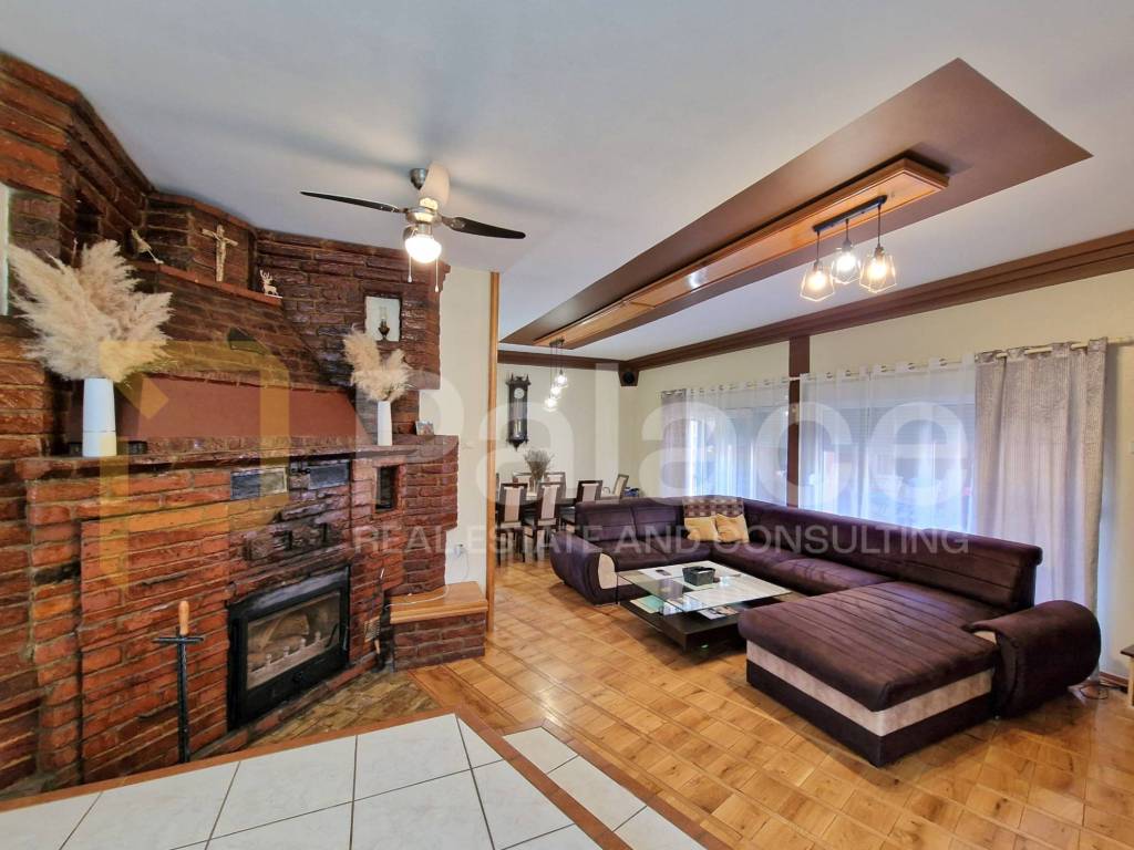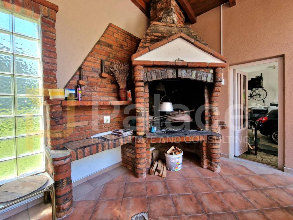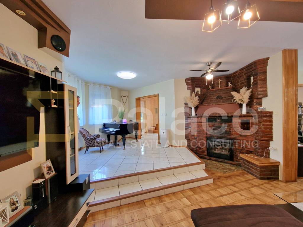 Keller: 2 RäumeErdgeschoss: Flur, geräumiges Wohnzimmer mit großem Kamin, Esszimmer, Küche, Badezimmer mit WC. Vom Esszimmer gelangt man auf eine überdachte Terrasse mit einem gemauerten Grill.1. Stock: Flur, 3 Zimmer, von denen zwei Zugang zu einem Balkon haben. Das dritte Zimmer verfügt über einen begehbaren Kleiderschrank und Zugang zu einem Badezimmer mit WC, das auch vom Flur aus betreten werden kann.Das Haus ist thermisch isoliert, mit Gasheizung und einer Kombination aus Fußbodenheizung (Fliesen) und Heizkörpern auf jeder Etage mit Thermostatventilen an den Heizkörpern + geschlossener Kamin, der über einen eigenen Holzkessel das Wasser in den Heizkörpern beheizt. Salamander-Fenster, Aluminium-Rollläden.