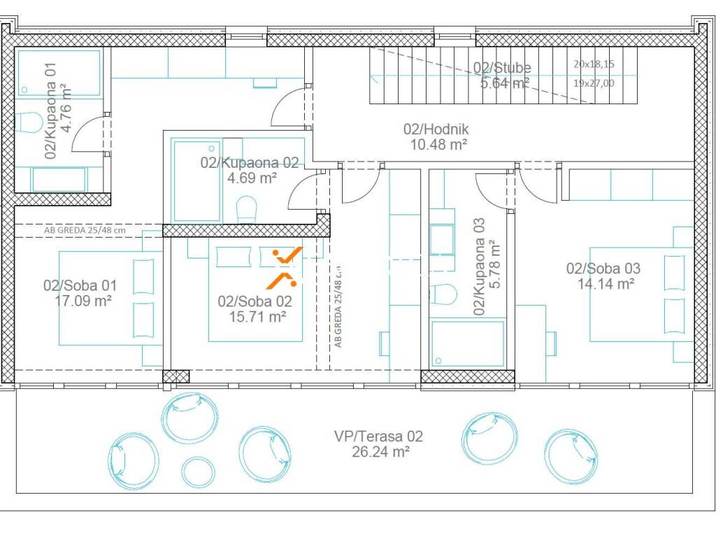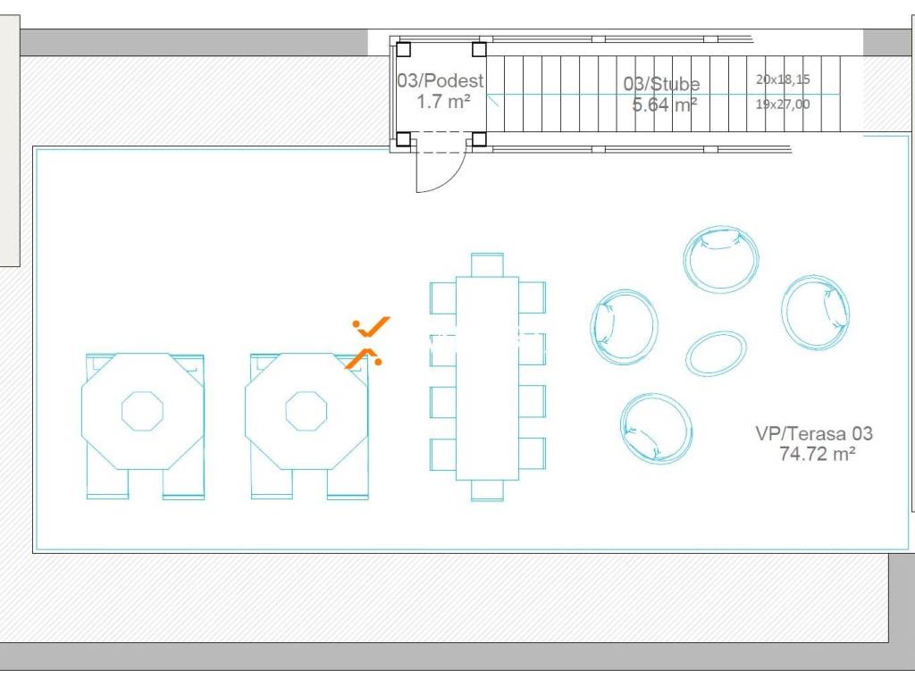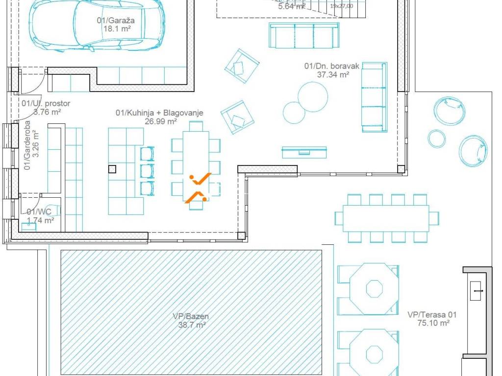 Das Haus besteht aus Erdgeschoss und Obergeschoss. Im Erdgeschoss sind eine Garage, Flur, Garderobe, Toilette, Küche mit Esszimmer und Wohnzimmer und eine teilweise überdachte Terrasse mit Swimmingpool. Fläche des Erdgeschosses beträgt 210,63 m2. Darüber hinaus sind im ersten Stock Flur, 2 Schlafzimmer mit eigenen Bädern, ein weiteres Schlafzimmer, Badezimmer und eine überdachte Terrasse. 1. Etage hat eine Fläche von 104,53 m2. Eine Innentreppe führt weiter zur Dachterrasse von 82,06 m2.