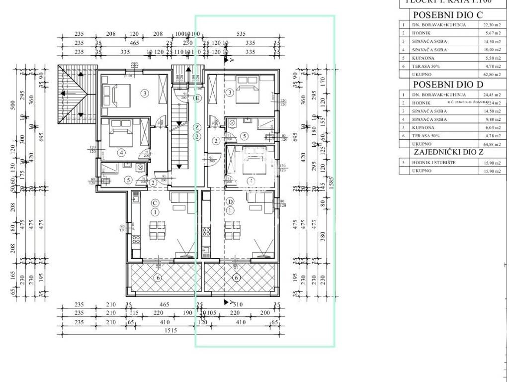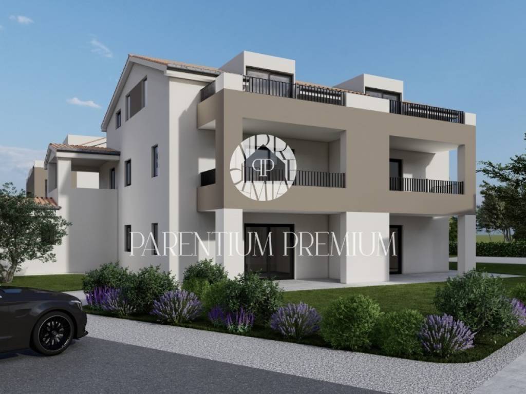 Die Wohnung im Erdgeschoss mit einer Gesamtfläche von ca. 65 m2 besteht aus einem Wohnzimmer, einer Küche, einem Esszimmer, zwei Schlafzimmern, einem Badezimmer, einer großen Terrasse und einem großzügigen Garten.