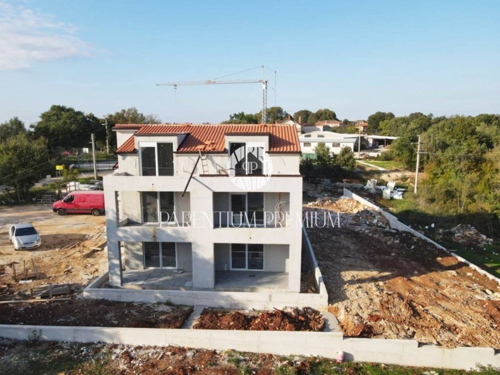 Am Ende der Bauarbeiten steht ein neues und modernes Gebäude, umgeben von Wald und Grün.