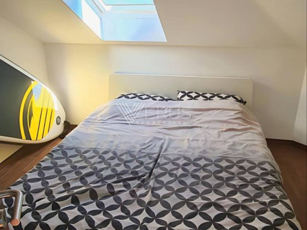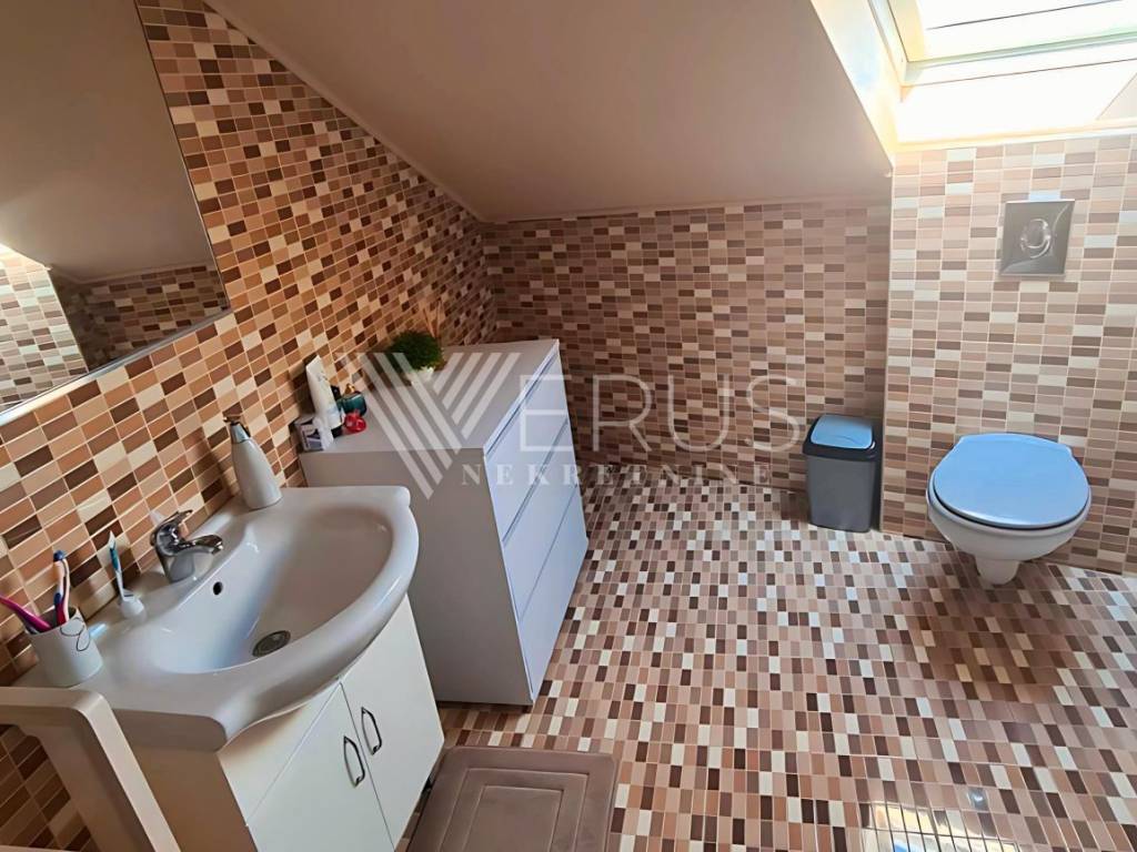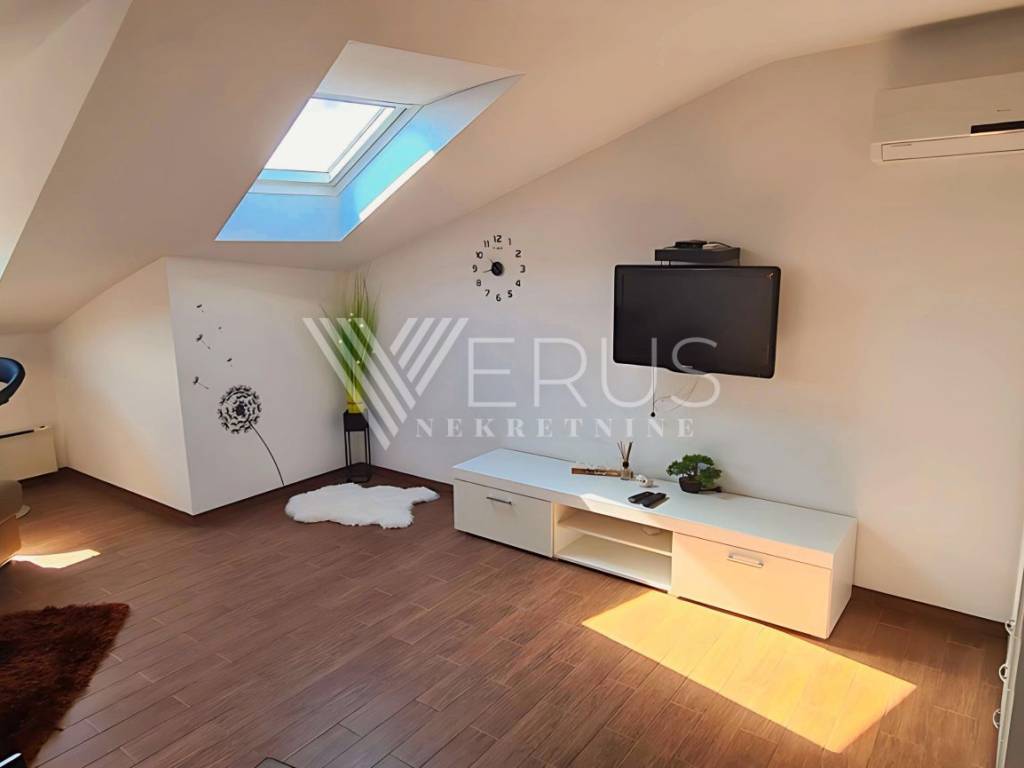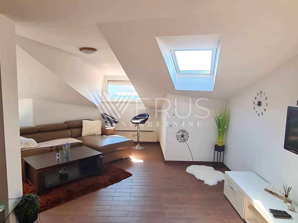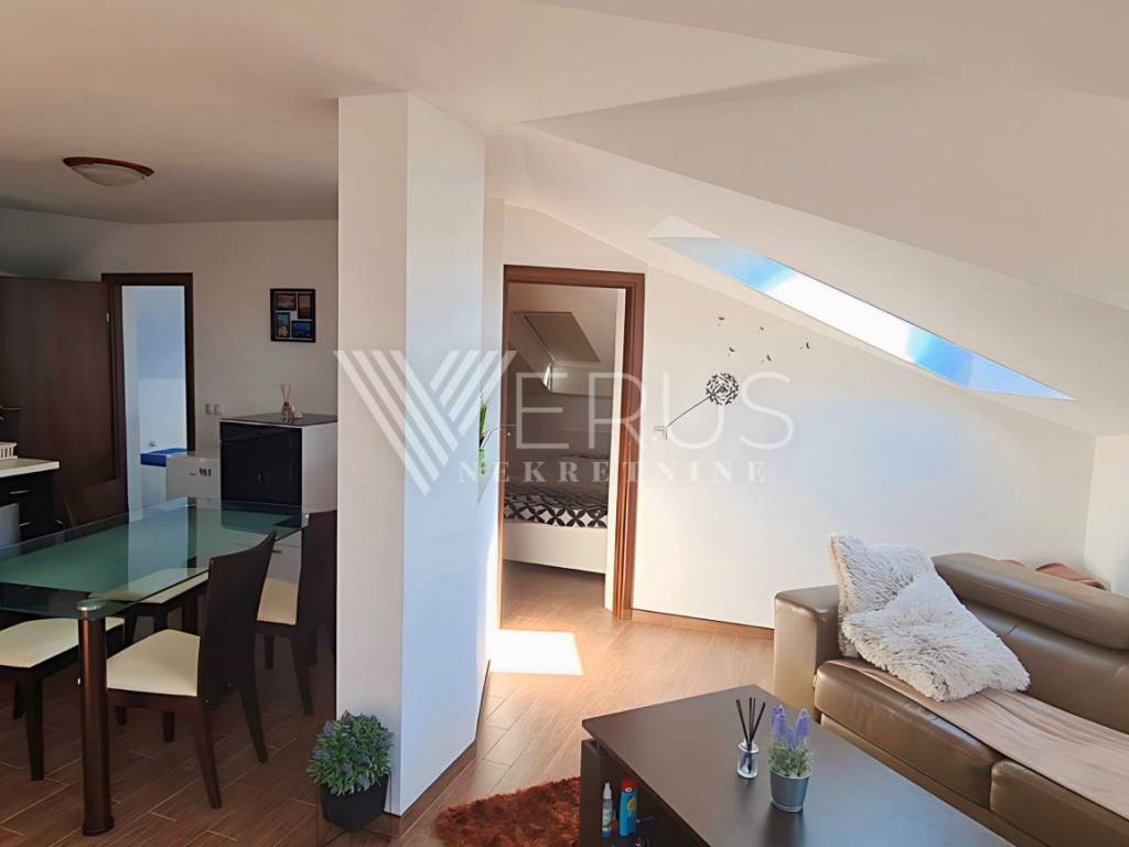 Die Wohnung besteht aus zwei Schlafzimmern, einem Badezimmer und einem geräumigen Wohnzimmer, das mit der Küche und dem Esszimmer verbunden ist, was dem Raum zusätzliche Offenheit und Funktionalität verleiht. Die Grundrissfläche der Wohnung beträgt 70 m², während aufgrund der Neigung 50 m² in den Eigentumsunterlagen eingetragen sind.