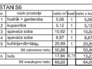 Die Wohnung S6 befindet sich im ersten Stock des Gebäudes und besteht aus einem Flur, zwei Schlafzimmern, einem Wohnzimmer mit Küche und Essbereich sowie einem Badezimmer. Die gesamte Nettofläche der Wohnung beträgt 68,50 m (Wohnbereich 64,09 m). Die Wohnung wird im Schlüsselfertig-System übergeben, einschließlich aller Badezimmer- und Sanitärmöbel, vollständigen Bodenbelägen (Fliesen oder Laminatparkett), sämtlichen Steckdosen und Schaltern sowie Wänden und Decken in Weiß.