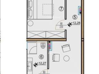Die zweigeschossige Wohnung im ersten Stock verfügt über ein Schlafzimmer, eine Küche mit Essbereich, ein Badezimmer, eine Loggia und eine Treppe, die in das zweite Geschoss führt; dort befinden sich ein Flur mit Treppe, ein Badezimmer, ein Schlafzimmer und eine Dachterrasse.