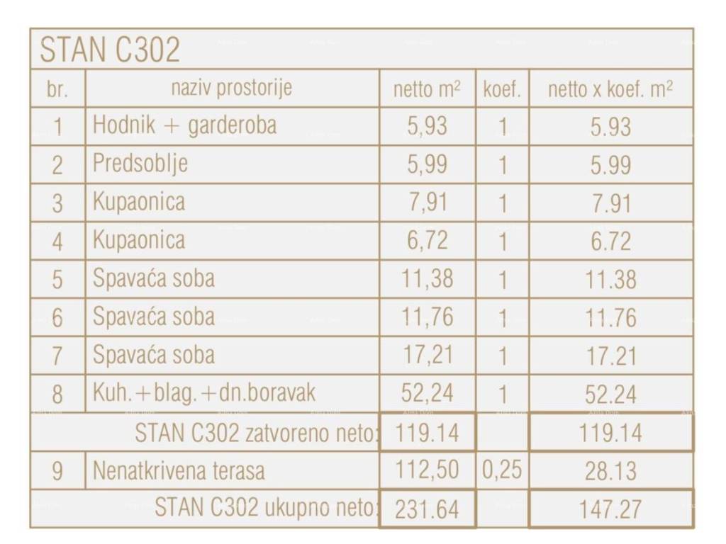 Die Wohnungen werden schlüsselfertig verkauft, mit einem voll ausgestatteten Badezimmer (Möbel und Sanitärkeramik), Bodenbelägen in allen Räumen (Keramik der Klasse 1, Laminat), installierten Elektroinstallationen, eingebauter Klimaanlage, Innenschreinereiarbeiten, Außenschreinerei aus PVC oder ALU, einbruch- und feuersichere Eingangstüren, Antennensystem, UTP-Netzwerk sowie weiße Wände und Decken.