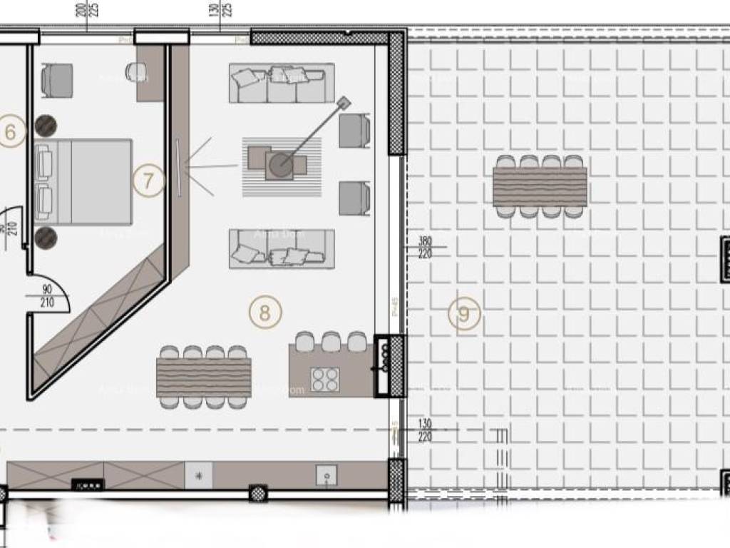 Flur, Diele, Küche+Esszimmer+Wohnzimmer, 2 Badezimmer, 3 Schlafzimmer und große, nicht überdachte Terrasse.