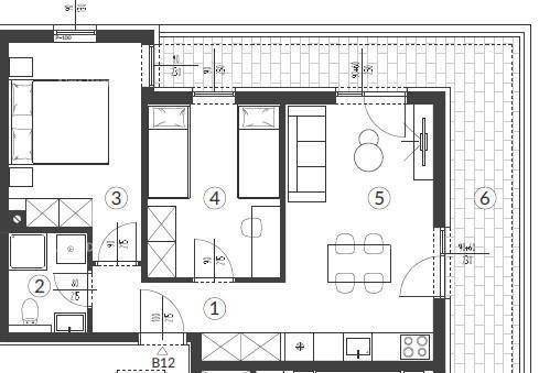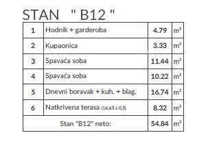Die Wohnung B12 mit einer Fläche von 54,84 m befindet sich im 2. Stock des Gebäudes und besteht aus: Flur + Garderobe, Wohnzimmer mit Küche und Essbereich, 2 Schlafzimmer, Badezimmer und überdachter Terrasse. Die Wohnungen werden mit Inverter-Klimaanlagen, Fußbodenheizung in den Badezimmern, hochwertigen Fliesen und Böden ausgestattet. Zur Wohnung gehört ein Parkplatz. Der Einzug in die Wohnungen ist für Ende 2026 geplant.