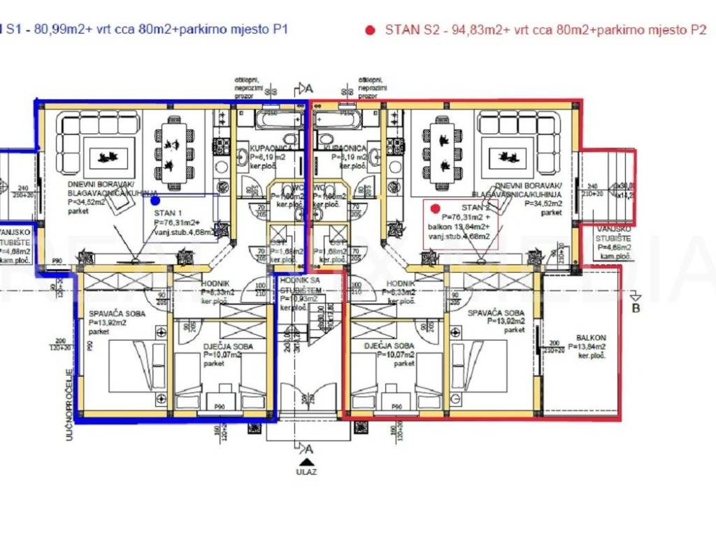 Predmetni stan oznake S2 nalazi se u prizemlju zgrade korisne površine 188,58 m2. Stan sačinjava kuhinja, blagovaonica i dnevni boravak sa izlazom na terasu i VRT (cca. 80 m2), hodnik, kupaonica, wc, ostava te dvije spavaće sobe.