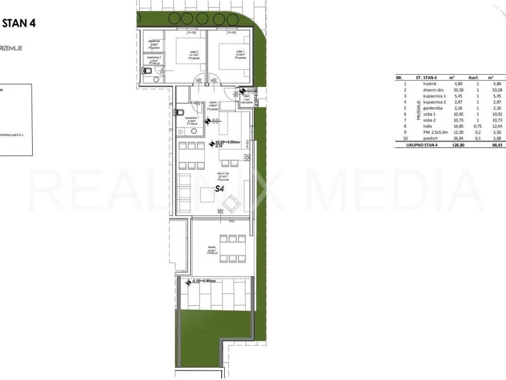 PRIVLAKA APARTMANI 90 METARA OD MORA! Predstavljamo vam vrhunski projekt novogradnje u Privlaci kod Zadra. Projekt se sastoji od 10 luksuznih stanova koje odlikuje komfor, vrhunska kvaliteta gradnje te izuzetno atraktivna lokacija u neposrednoj blizini mora. U ponudi su stanovi dvosobni i trosobni kvadrature od 54 m2 do 108 m2. Svakom stanu pripada vanjsko parkirno mjesto. Zgrada je koncipirana tako da svaka etaža ima 4 stambene jedinice od kojih su 2 stana dvoetažna s krovnim terasama. Prizemlje se sastoji od dvosobna 4 stana kojima pripadaju vrtovi koji će biti uređeni u mediteranskom stilu. Gradnja se radi prema najvišim standardima i koriste se visokokvalitetni materijali i oprema. Keramika, parketi i sanitarije visoke kvalitete renomiranih proizvođača. Vrhunska vanjska stolarija s električnim roletama i ugrađenim zaštitama od komaraca. Fasadna izolacija je 10 cm. Sve prostorije su opremljene klima uređajima, te podnim grijanjem koje se postavlja u cijeli stan osim u spavaće sobe. Prvi kat se sastoji od 2 trosobna stana i 2 dvoetažna stana (dnevni dio), dok su na drugom katu također 2 trosobna stana i spavaći dio dvoetažnih stanova. Stanovima na drugom katu i dvoetažnim stanovima pripadaju krovne terase odnosno zona za uživanje i opuštanje. Stanovi su tako pozicionirani da svi stanovi imaju pogled na more. Velike natkrivene terase i krovne terase, te uređeni vrtovi svim stanarima osiguravaju privatnost i prostor za uživanje u predivnom pogledu, zalasku sunca i šumovima valova koji nose miris mora i soli. Stanari imaju direktan pristup na plažu koja je udaljena samo 90 metara od zgrade. Stan oznake S4 nalazi se u prizemlju i sastoji se od dvije velike spavaće sobe od koji je jedna spavaća soba dječja/gostinjska, a druga spavaća master bedroom koja ima vlastitu garderobu i kupaonicu. U nastavku stana su hodnik, kupaonica, veliki dnevni boravak s open space kuhinjom i blagovaonicom. Iz dnevnog boravka se izlazi na prostranu lođu i u vrt koji okružuje stan.