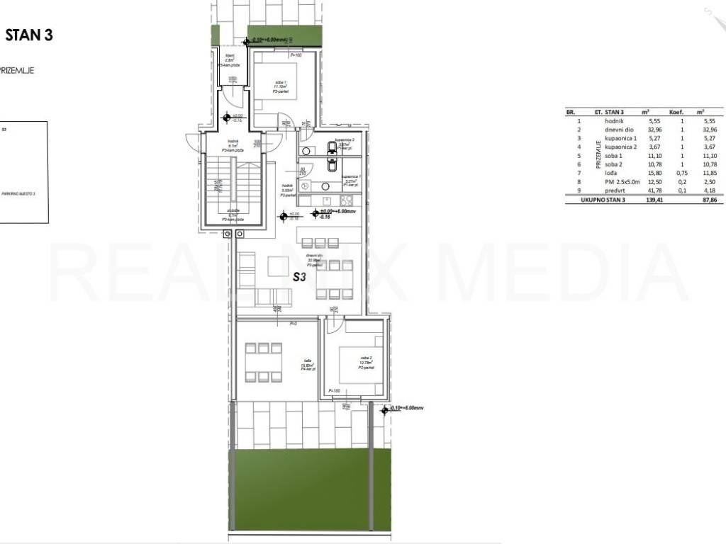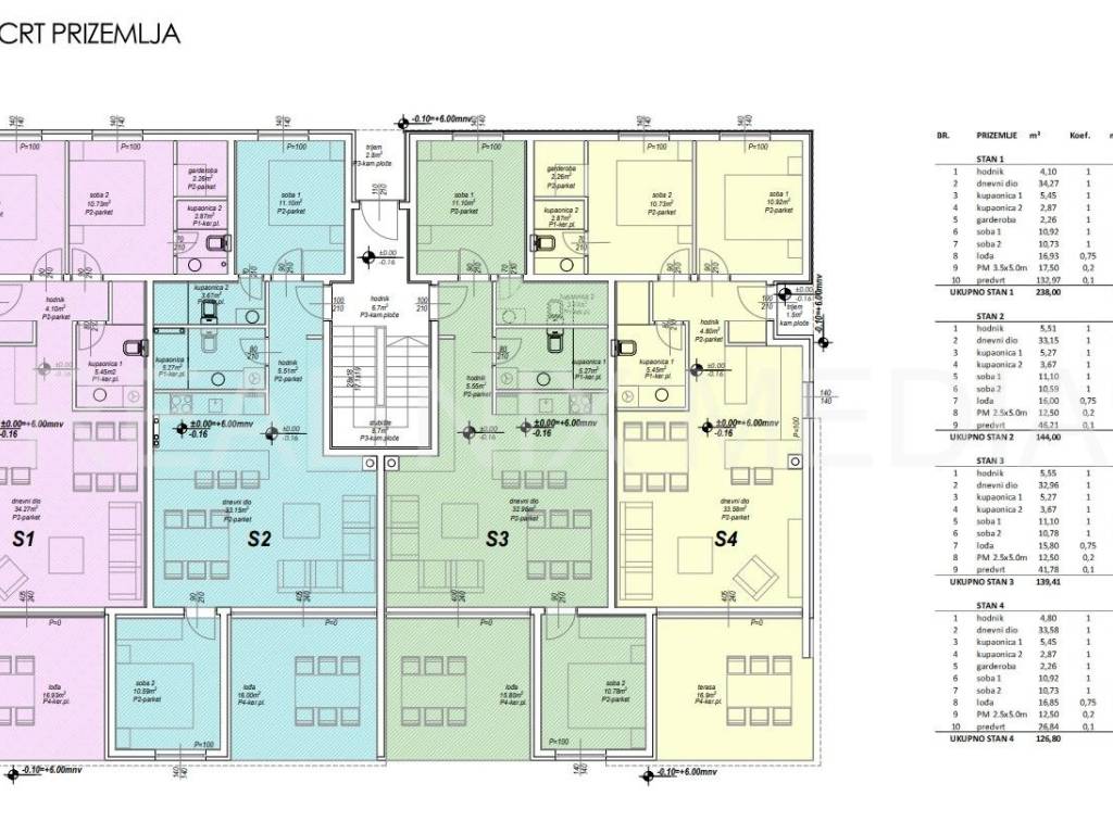 PRIVLAKA - APARTMANI 90 METARA DO MORA! Predstavljamo vam vrhunski projekt novogradnje u Privlaci kod Zadra. Projekt se sastoji od 10 luksuznih stanova koje odlikuje komfor, vrhunska kvaliteta gradnje te izuzetno atraktivna lokacija u neposrednoj blizini mora. U ponudi su stanovi dvosobni i trosobni kvadrature od 54 m2 do 108 m2. Svakom stanu pripada vanjsko parkirno mjesto. Zgrada je koncipirana tako da svaka etaža ima 4 stambene jedinice od kojih su 2 stana dvoetažna s krovnim terasama. Prizemlje se sastoji od dvosobna 4 stana kojima pripadaju vrtovi koji će biti uređeni u mediteranskom stilu. Gradnja se radi prema najvišim standardima i koriste se visokokvalitetni materijali i oprema. Keramika, parketi i sanitarije visoke kvalitete renomiranih proizvođača. Vrhunska vanjska stolarija s električnim roletama i ugrađenim zaštitama od komaraca. Fasadna izolacija je 10 cm. Sve prostorije su opremljene klima uređajima, te podnim grijanjem koje se postavlja u cijeli stan osim u spavaće sobe. Prvi kat se sastoji od 2 trosobna stana i 2 dvoetažna stana (dnevni dio), dok su na drugom katu također 2 trosobna stana i spavaći dio dvoetažnih stanova. Stanovima na drugom katu i dvoetažnim stanovima pripadaju krovne terase odnosno zona za uživanje i opuštanje. Stanovi su tako pozicionirani da svi stanovi imaju pogled na more. Velike natkrivene terase i krovne terase, te uređeni vrtovi svim stanarima osiguravaju privatnost i prostor za uživanje u predivnom pogledu, zalasku sunca i šumovima valova koji nose miris mora i soli. Stanari imaju direktan pristup na plažu koja je udaljena samo 90 metara od zgrade. Stan oznake S3 nalazi se u u prizemlju i sastoji se od dvije komforne spavaće sobe od kojih je jedna dječja/gostinjska soba, a druga spavaća master bedroom koja ima vlastitu kupaonicu. U nastavku stana su hodnik, kupaonica, veliki dnevni boravak s open space kuhinjom i blagovaonicom. Iz dnevnog boravka se izlazi na prostranu lođu i u vrt.