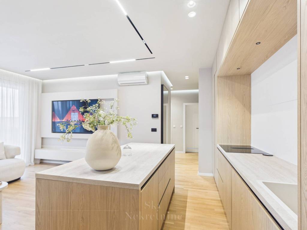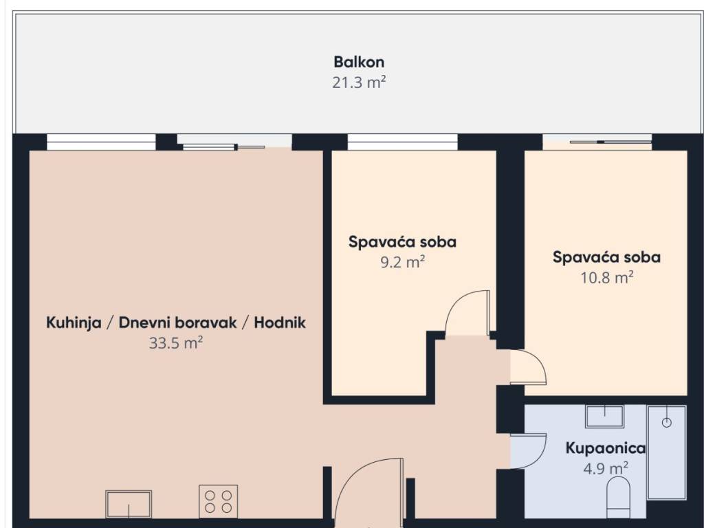 Površina zatvorenog dijela iznosi 57,33 m, a sastoji se od ulaznog hodnika, open-space dnevnog boravka s kuhinjom i blagovaonicom, dvije spavaće sobe, kupaonice te prostranog balkona površine 21,03 m2 (neto 10,65m2)