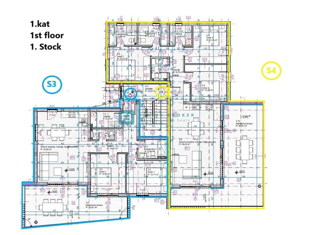 Wohnung S4 befindet sich im 1. Obergeschoss und bietet eine Nutzfläche von 133,03 m² (105,01 m² Wohnfläche + 46,05 m² Terrasse + 25 m² Stellplatz). Sie besteht aus einem Eingangsbereich, einem Flur, einem separaten Badezimmer, einem WC, drei geräumigen Schlafzimmern (eines davon mit eigenem Bad), einem Hauswirtschaftsraum, einer offenen Küche mit Essbereich und einem Wohnzimmer mit Zugang zu einer überdachten Terrasse von 46,05 m². Zur Wohnung gehören zwei Stellplätze mit je 25 m².