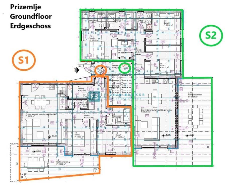 Wohnung S6 befindet sich im 2. Obergeschoss und bietet eine Nutzfläche von 133 m² (104,98 m² Wohnfläche + 46,05 m² Terrasse + 25 m² Parkplatz). Sie besteht aus einem Eingangsbereich, einem Flur, einem separaten Badezimmer, einem WC, drei geräumigen Schlafzimmern (eines davon mit eigenem Bad), einem Hauswirtschaftsraum, einer offenen Küche mit Essbereich und einem Wohnzimmer mit Zugang zu einer überdachten Terrasse von 46,05 m². Die Wohnung verfügt über zwei Parkplätze mit je 25 m². Der Preis beträgt 409.000 € (inkl. MwSt. – der Käufer ist von der 3%igen Grundsteuer befreit).