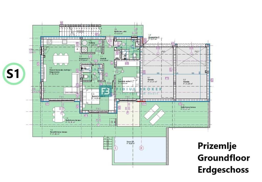 Neubau eines modernen Wohngebäudes mit insgesamt drei Wohneinheiten. Das Gebäude erstreckt sich über drei Etagen: Erdgeschoss, 1. Obergeschoss und 2. Obergeschoss. Es wurde mit hochwertigen Materialien nach neuesten Baustandards errichtet: Polystyrolfassade, feuer- und einbruchsichere Eingangstüren, Aluminiumfenster und -türen mit Dreifachverglasung, Aluminium-Schiebetüren für den Balkon, elektrische Rollläden mit Insektenschutzgittern, Natursteinböden aus Plano, moderne Badezimmerausstattung, Klimaanlage und TV-Anschluss in Schlaf- und Wohnzimmer, Fußbodenheizung und Glasgeländer auf den Terrassen. Wohnung S1 verfügt über zwei Außenstellplätze im Innenhof, die Wohnungen S2 und S3 jeweils über einen Außenstellplatz und einen Garagenstellplatz.