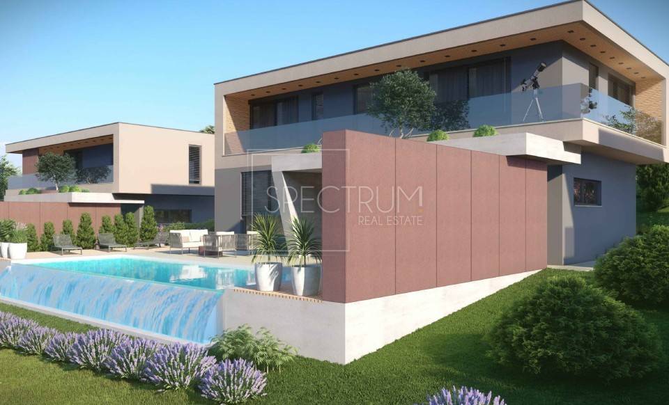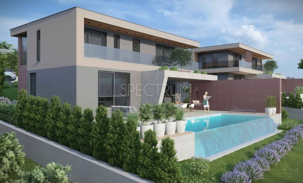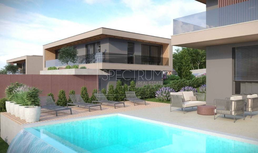 Die Villa bietet eine Wohnfläche von 216,69 m². Im Erdgeschoss befinden sich eine geräumige Eingangshalle mit Garderobe, ein großzügiges Wohnzimmer mit offener Küche und Essbereich, ein Wellnessbereich mit Sauna und Whirlpool sowie ein Gäste-WC. Vom Wohnzimmer gelangt man auf eine überdachte Terrasse mit Liegewiese und einem 37 m² großen Pool. Eine Innentreppe führt in den ersten Stock mit Flur, drei geräumigen Schlafzimmern, jeweils mit eigenem Bad. Zwei der Schlafzimmer bieten Zugang zu einer Loggia und einer überdachten Terrasse mit herrlichem Ausblick.