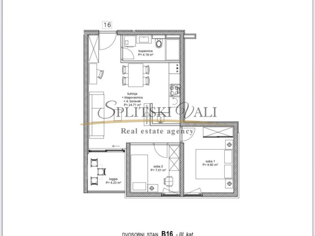 Stan se sastoji od dnevnog boravka s kuhinjom i blagovaonicom, dvije spavaće sobe, kupaonice i loggie površine 4,23 m. Ukupna obračunska površina iznosi 48,88 m. Tlocrt i detaljna specifikacija nalaze se u slikama oglasa.