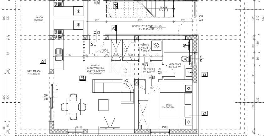Im Erdgeschoss des Wohngebäudes befindet sich die 67,18 m² große Wohnung S1. Sie ist ideal für alle, die Wert auf ein ausgewogenes Verhältnis von Privatsphäre, Komfort und einem angenehmen Aufenthalt im Freien legen. Die gelungene Raumaufteilung fällt bereits beim Betreten auf: Der 3,23 m² große Eingangsbereich führt in einen hellen, 26,05 m² großen Wohnbereich, der Küche, Esszimmer und Wohnzimmer miteinander verbindet – ein perfekter Ort für Alltag und geselliges Beisammensein. Der 1,90 m² große Flur trennt den privaten Teil der Wohnung dezent ab, während der 3,20 m² große Hauswirtschaftsraum und Abstellraum zusätzlichen Komfort bieten. Das 10,20 m² große Schlafzimmer ist als ruhiger Rückzugsort zum Entspannen gestaltet, und das 4,50 m² große Badezimmer ist funktional in die gesamte Wohnung integriert.