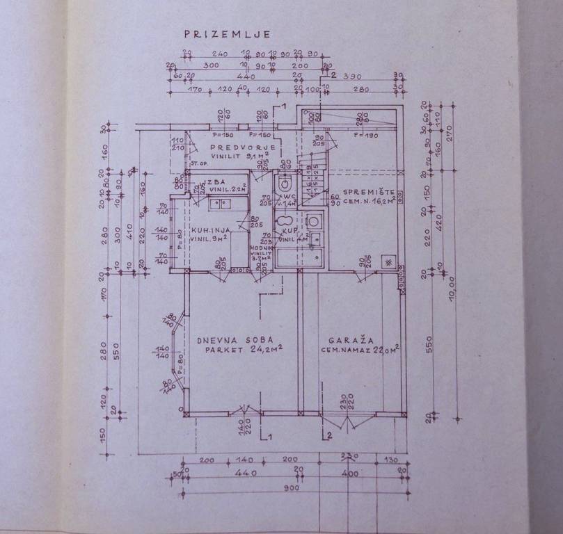Prizemlje: hodnik, kuhinja, blagovaonica, kupaonica, zaseban toalet, spremište i garaža;
