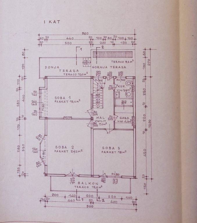 Prvi kat: hodnik(stepenice), vešeraj, kupaonica, dnevni boravak, 2 spavaće sobe i 2 terase;