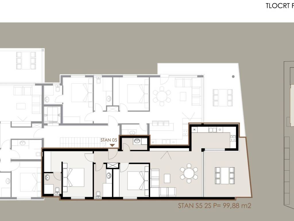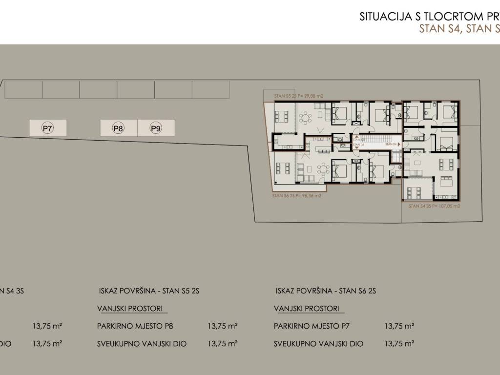 Stan S5 – prvi kat, ukupne površine 99,88 m², sastoji se od: hodnika, dvije kupaonice, dvije spavaće sobe, prostranog dnevnog boravka s kuhinjom i blagovaonicom u otvorenom konceptu, praonice i natkrivene terase.