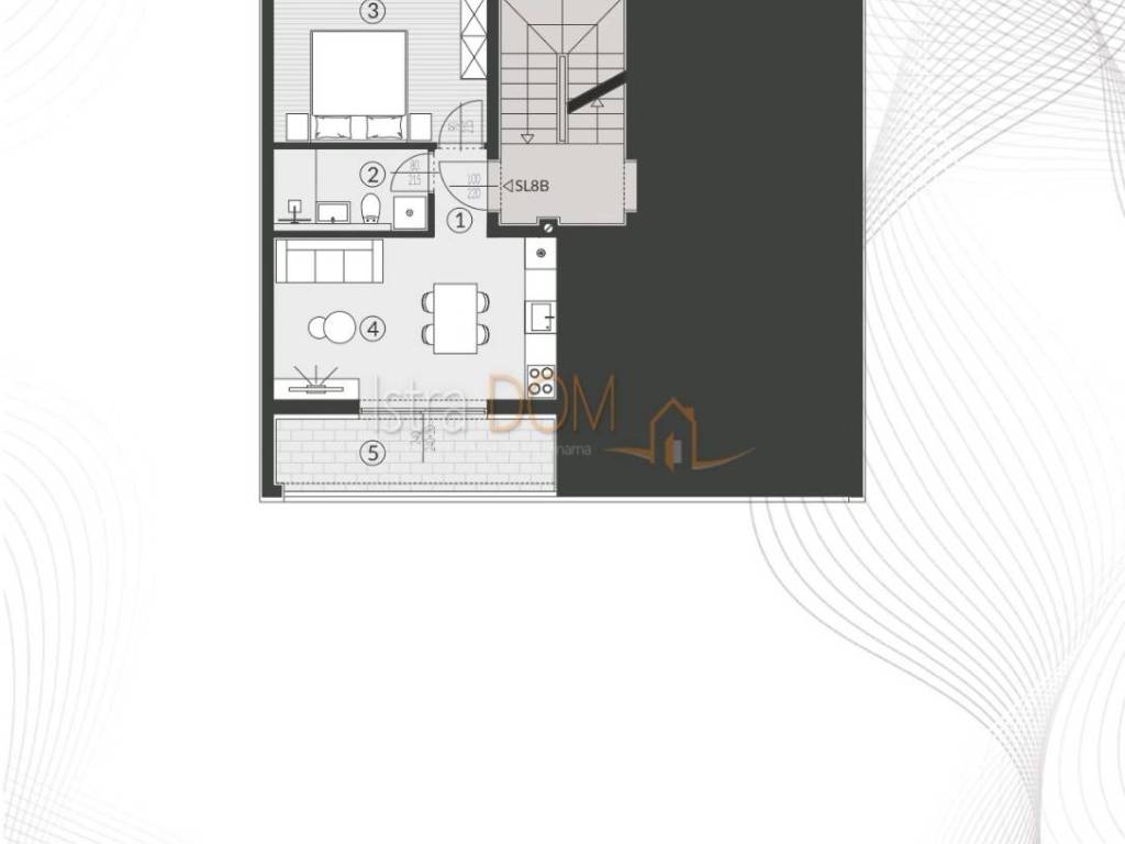 Die Wohnung besteht aus einem Flur, einem Schlafzimmer, einem Badezimmer, einem Wohnzimmer mit angeschlossenem Esszimmer und einer Küche.