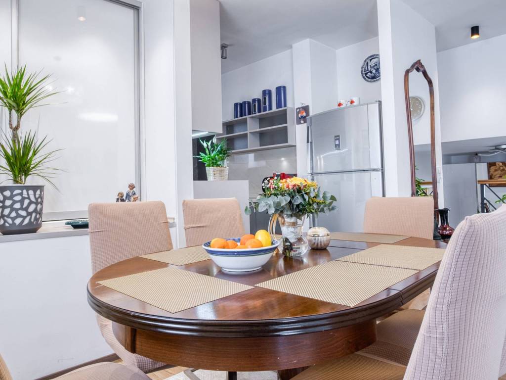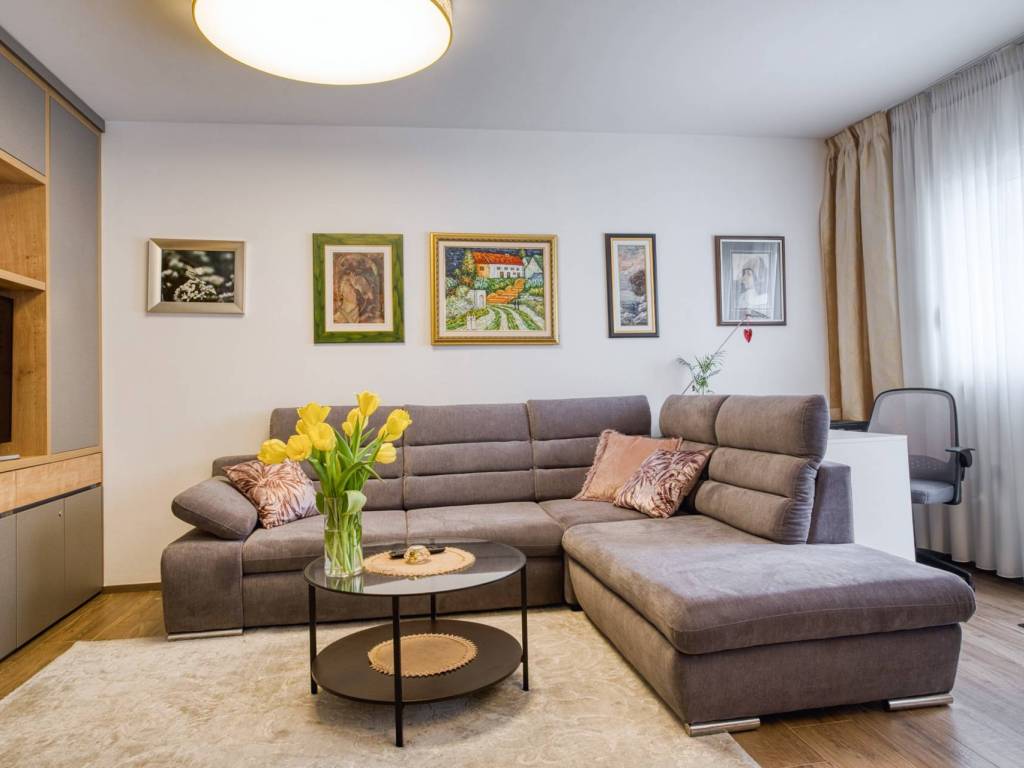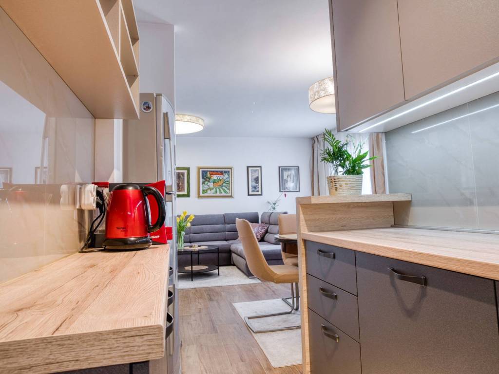 Dnevni boravak je klimatiziran, s izlazom na manju terasu orijentiranu na mirniju sjevernu stranu (Park Grmoščica). Prostor je jako lijepo uređen, ima prekrasan kutni trosjed, zidni set s policama i mjestom za veliki TV, blagovaonski stol za šest osoba, te manju radnu zonu. U jednom dijelu boravka se nalazi niša koja se može koristiti kao spremište.