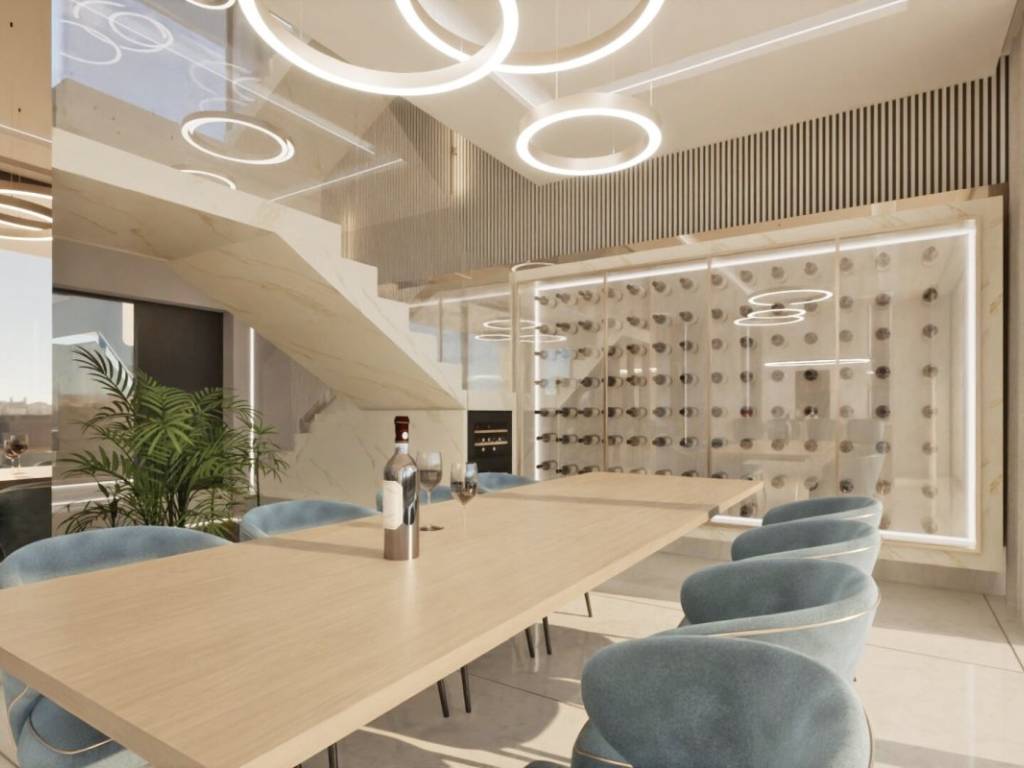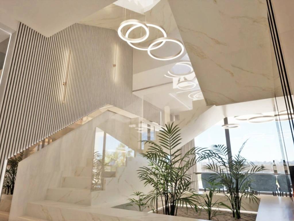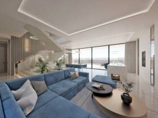 Das lichtdurchflutete Innere der Villa erstreckt sich über zwei Etagen. Im Erdgeschoss befindet sich ein großzügiger, offener Wohnbereich mit Küche, Esszimmer und Wohnzimmer mit Zugang zu einer großen Terrasse. Zusätzlich gibt es ein Spielzimmer, einen Fitnessraum mit Sauna und Whirlpool sowie ein Gäste-WC. Im ersten Stock befinden sich vier komfortable Schlafzimmer mit jeweils eigenem Bad und Zugang zu einem überdachten Balkon mit freiem Meerblick sowie ein zusätzlicher Hauswirtschaftsraum. Die Villa verfügt über Fußbodenheizung und eine Wärmepumpe zur Klimatisierung und bietet zwei Garagenstellplätze sowie zwei Außenstellplätze.