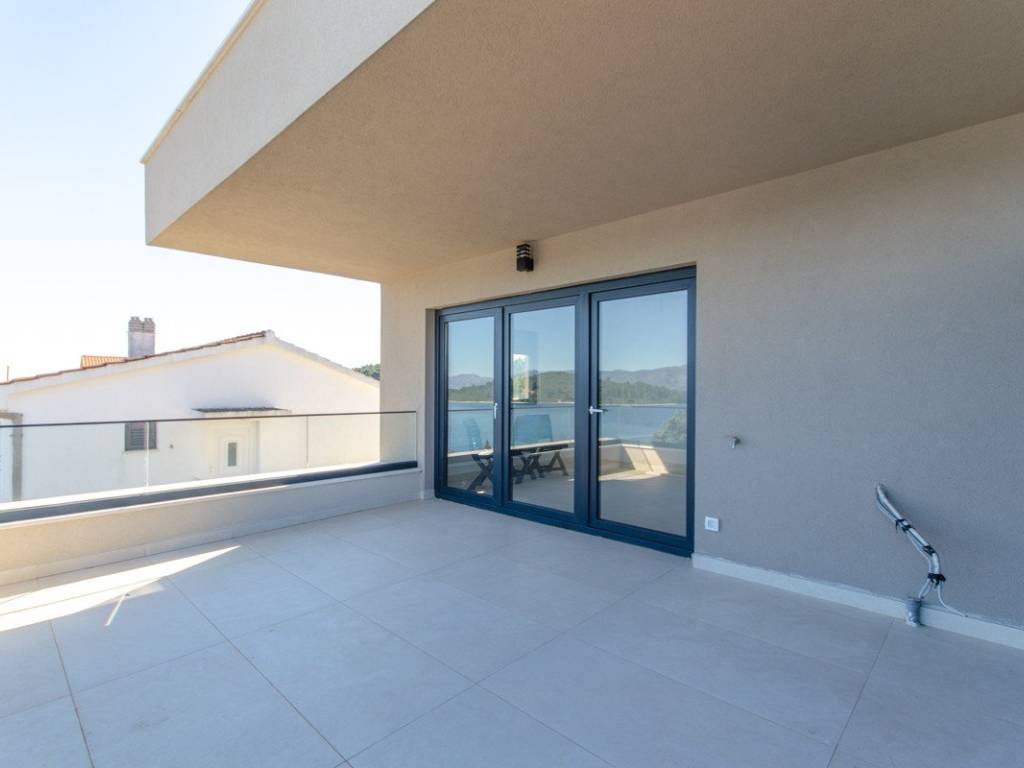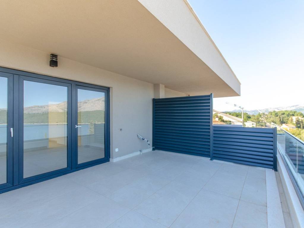 Das Obergeschoss bildet den privaten Bereich der Wohnung und besteht aus einem 30 m großen Schlafzimmer (16 m Schlafbereich, 14 m Ankleidezimmer) mit angrenzendem Badezimmer. Auf der Südseite befindet sich eine Terrasse, während sich auf der Vorderseite ein geräumiger, teilweise überdachter Balkon mit Meerblick befindet.