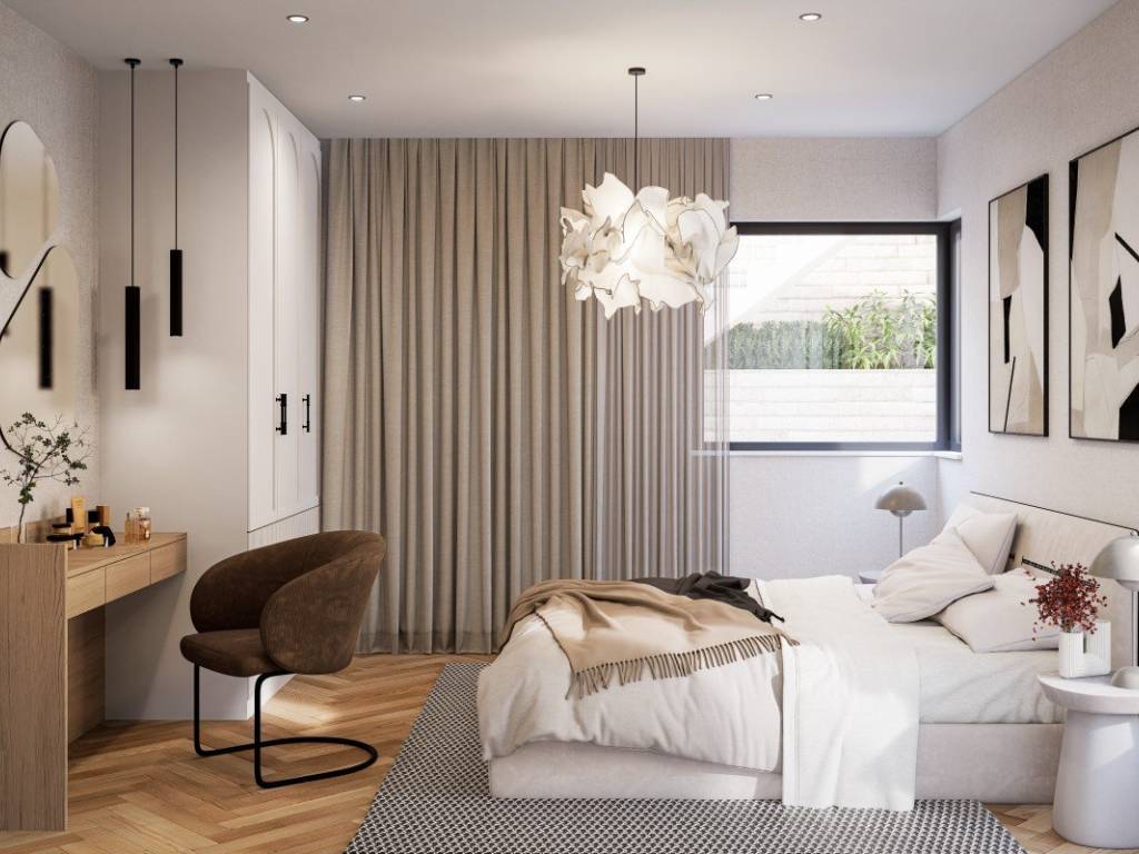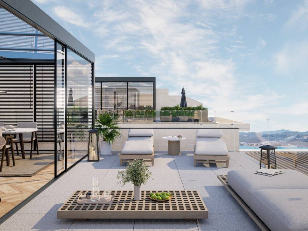 Die Wohnung in einem Neubau mit Aufzug erstreckt sich über eine Fläche von 94,85 m und befindet sich im zweiten Stock. Sie besteht aus einem Wohnbereich mit Zugang zu einem Balkon mit Meerblick, einem Flur, zwei Schlafzimmern, zwei Bädern und einem Hauswirtschaftsraum. Eine Innentreppe führt in den vierten Stock, wo sich eine verglaste Dachterrasse befindet, die nach den Wünschen des Käufers gestaltet werden kann und ein WC beinhaltet.
