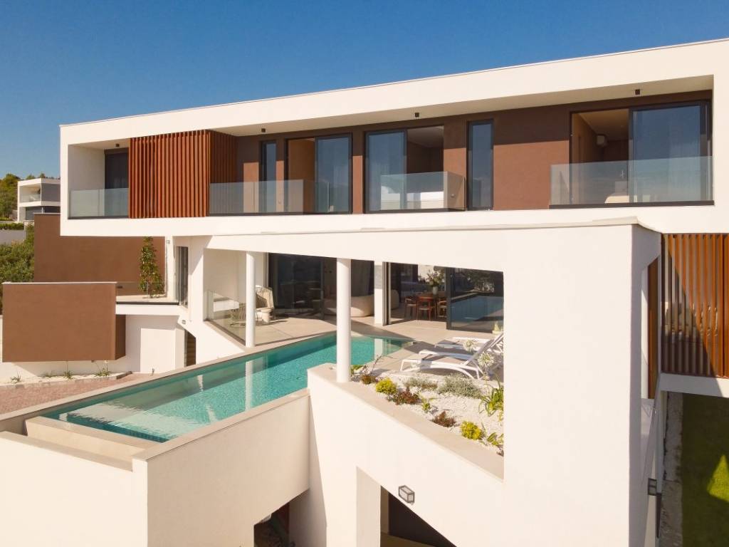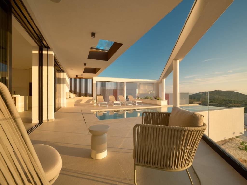 Der erste Stock besteht aus einem geräumigen Wohnzimmer mit moderner Küche, einem Arbeitszimmer (das auch als zusätzliches Schlafzimmer genutzt werden kann), einem Gäste-WC und zwei Terrassen eine mit Außenküche auf der Ostseite und die andere mit einem spektakulären Infinity-Pool auf der Westseite.