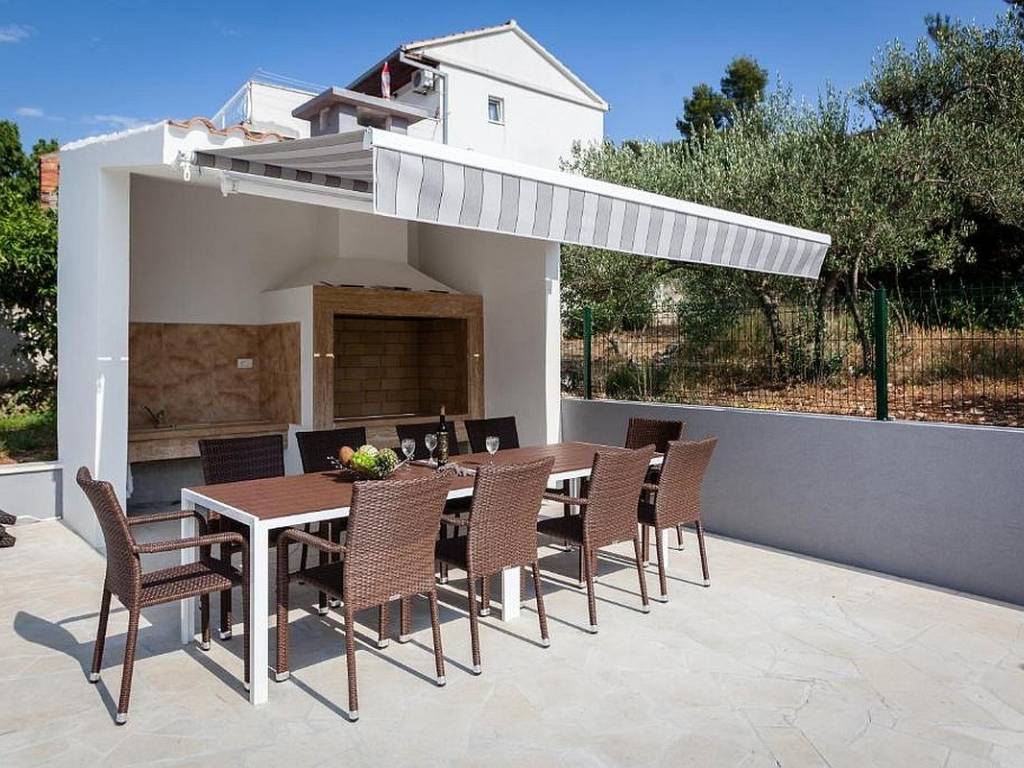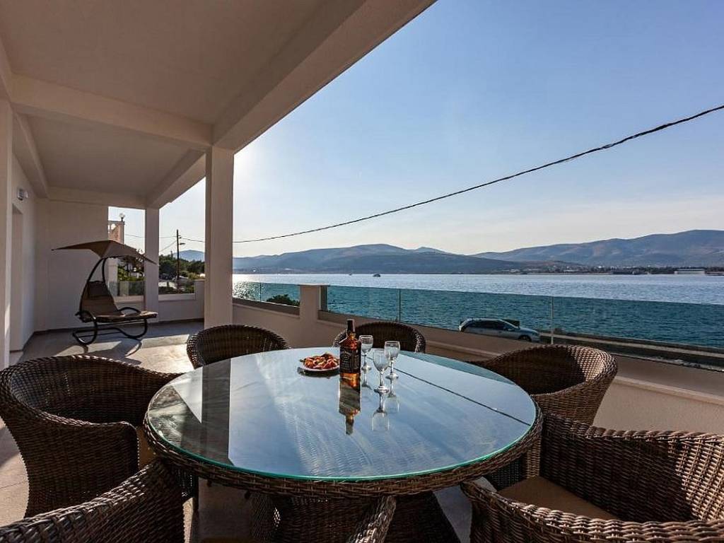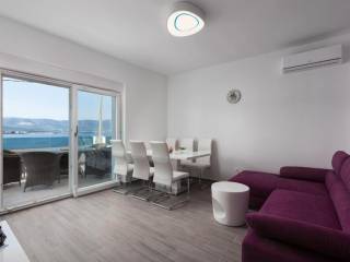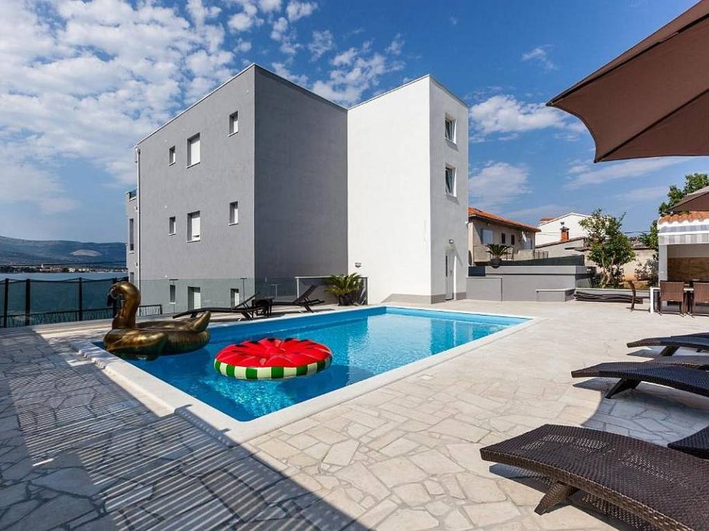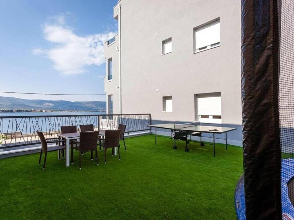 Zum Verkauf steht ein modernes Apartmenthaus in hervorragender Lage in erster Meeresreihe, ideal für private Nutzung und touristische Vermietung. Das Anwesen befindet sich an der attraktiven Nordseite der Insel Čiovo, die für ihre hervorragende Kombination aus friedlicher mediterraner Atmosphäre und der Nähe zur Stadt Trogir bekannt ist. Es besteht aus insgesamt vier geräumigen und funktional eingerichteten Apartments.