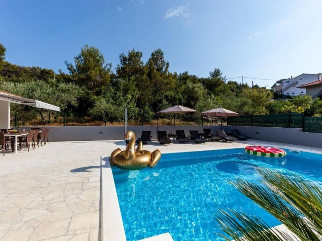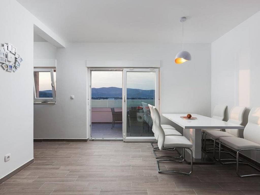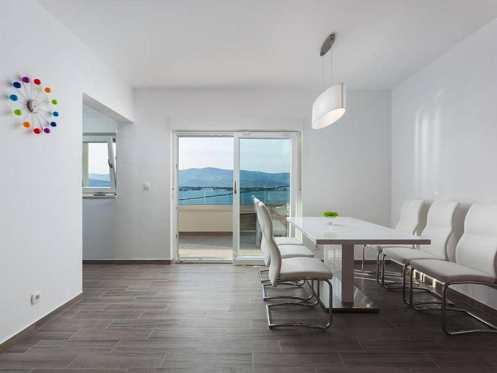 Die Lage der Immobilie ist hervorragend in unmittelbarer Nähe befinden sich ein Supermarkt, ein gepflegter Strand mit weiteren Annehmlichkeiten, ein Restaurant, Cafés und alle weiteren Annehmlichkeiten für einen hochwertigen und angenehmen Aufenthalt. Die Nähe zu Trogir und dem internationalen Flughafen Split unterstreicht den Investitionswert dieser Immobilie zusätzlich.