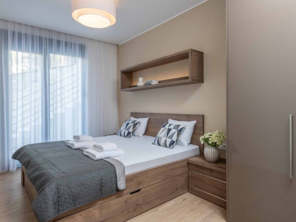 Die Wohnung besteht aus einem geräumigen Wohnzimmer mit Zugang zu einer 9 m großen, überdachten Terrasse mit freiem Meerblick. Zur weiteren Ausstattung gehören eine voll ausgestattete Küche, ein Flur, eine funktionale Waschküche, zwei Schlafzimmer (das Hauptschlafzimmer verfügt über ein eigenes Bad) und ein weiteres Badezimmer. Neben der Hauptterrasse bietet die Wohnung eine weitere 12 m große Terrasse, die zusätzlichen Platz zum Genießen im Freien bietet.
