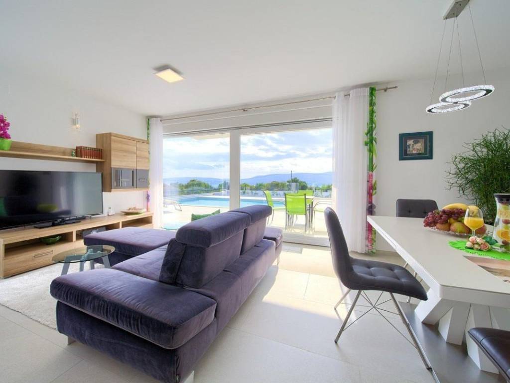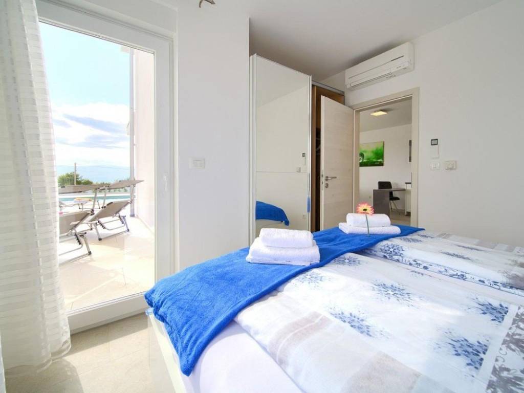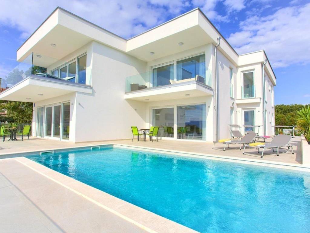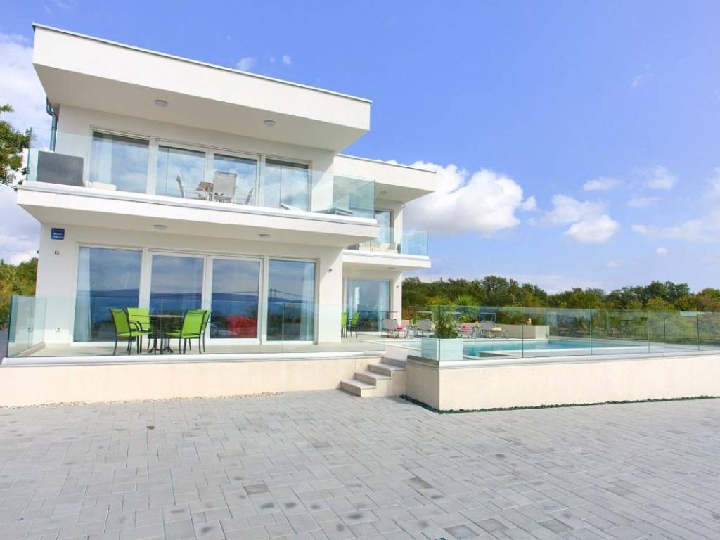 Zum Verkauf steht eine moderne Villa mit einer Gesamtwohnfläche von 410 m in der Nähe der Stadt Krk. Die Wohnfläche verteilt sich auf Keller, Erdgeschoss und Obergeschoss und steht auf einem 665 m großen Grundstück. Im Keller befinden sich eine Waschküche, ein Heizraum für die solare Warmwasserbereitung und eine Zentralheizung mit Stromanschluss. Im Erdgeschoss und Obergeschoss befinden sich vier Wohnungen mit jeweils einer Küche, einem Esszimmer, einem Wohnzimmer, zwei Schlafzimmern, zwei Bädern und einer geräumigen Loggia oder Terrasse mit offenem Meerblick.
