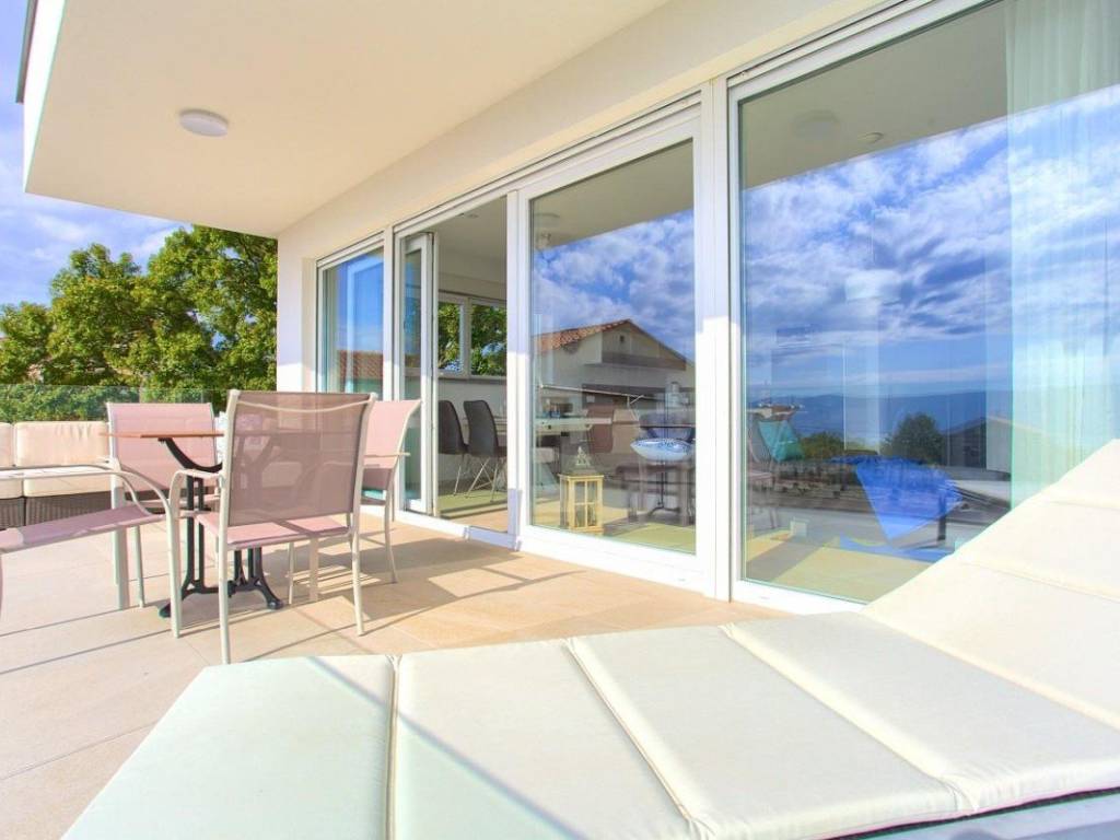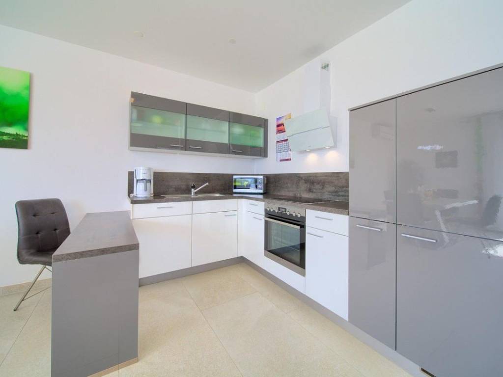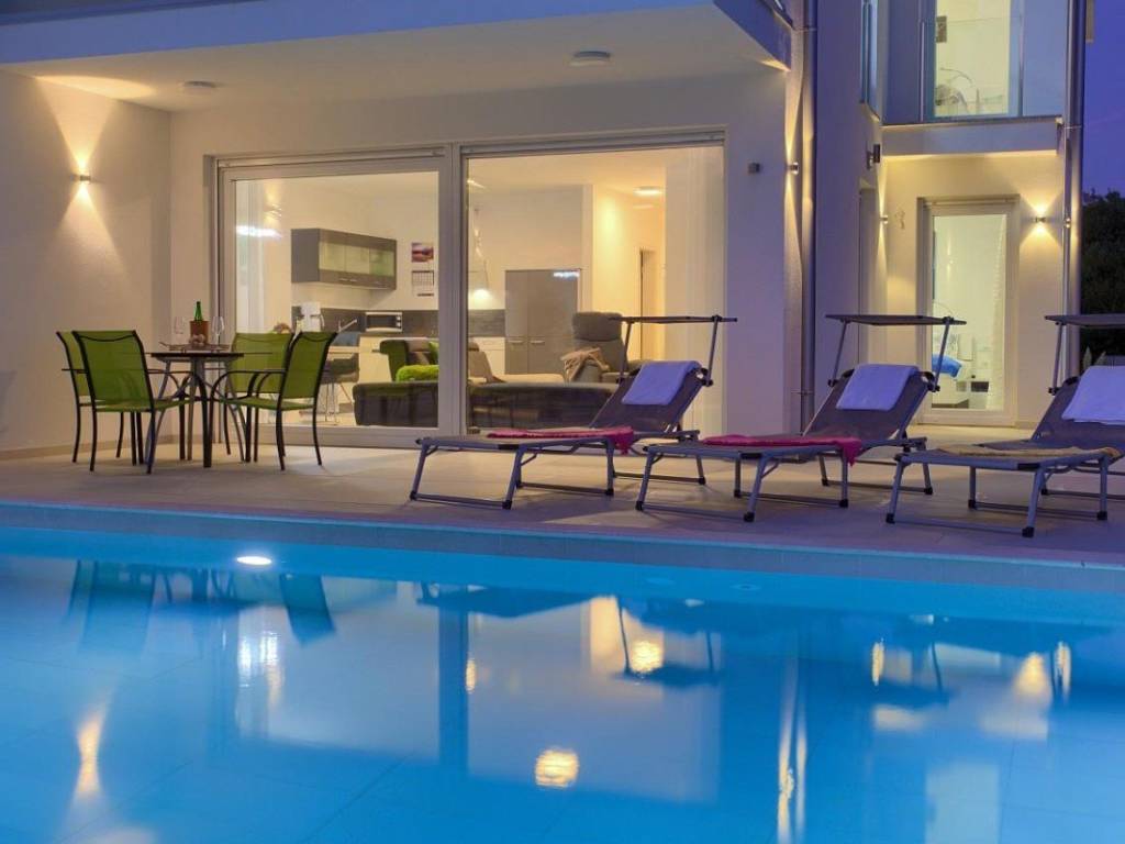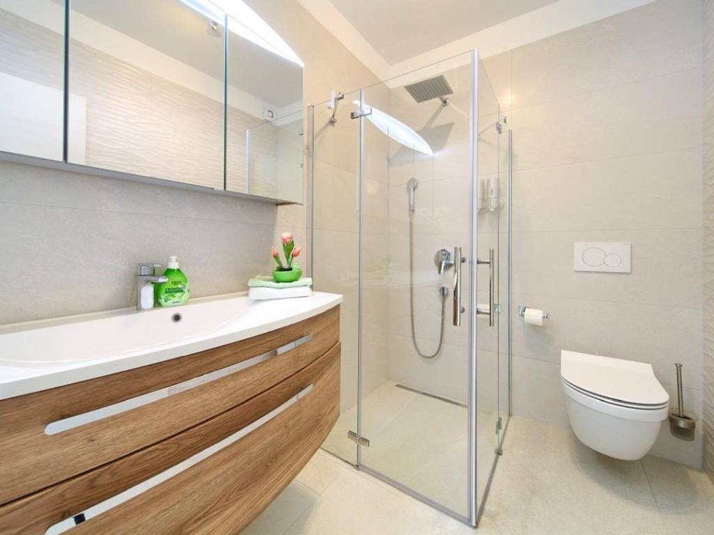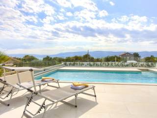 Zum Verkauf steht eine moderne Villa mit einer Gesamtwohnfläche von 410 m in der Nähe der Stadt Krk. Die Wohnfläche verteilt sich auf Keller, Erdgeschoss und Obergeschoss und steht auf einem 665 m großen Grundstück. Im Keller befinden sich eine Waschküche, ein Heizraum für die solare Warmwasserbereitung und eine Zentralheizung mit Stromanschluss. Im Erdgeschoss und Obergeschoss befinden sich vier Wohnungen mit jeweils einer Küche, einem Esszimmer, einem Wohnzimmer, zwei Schlafzimmern, zwei Bädern und einer geräumigen Loggia oder Terrasse mit offenem Meerblick.