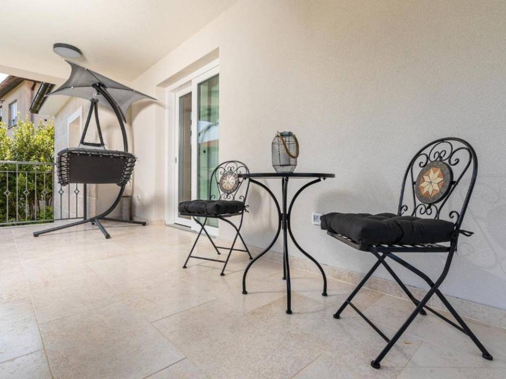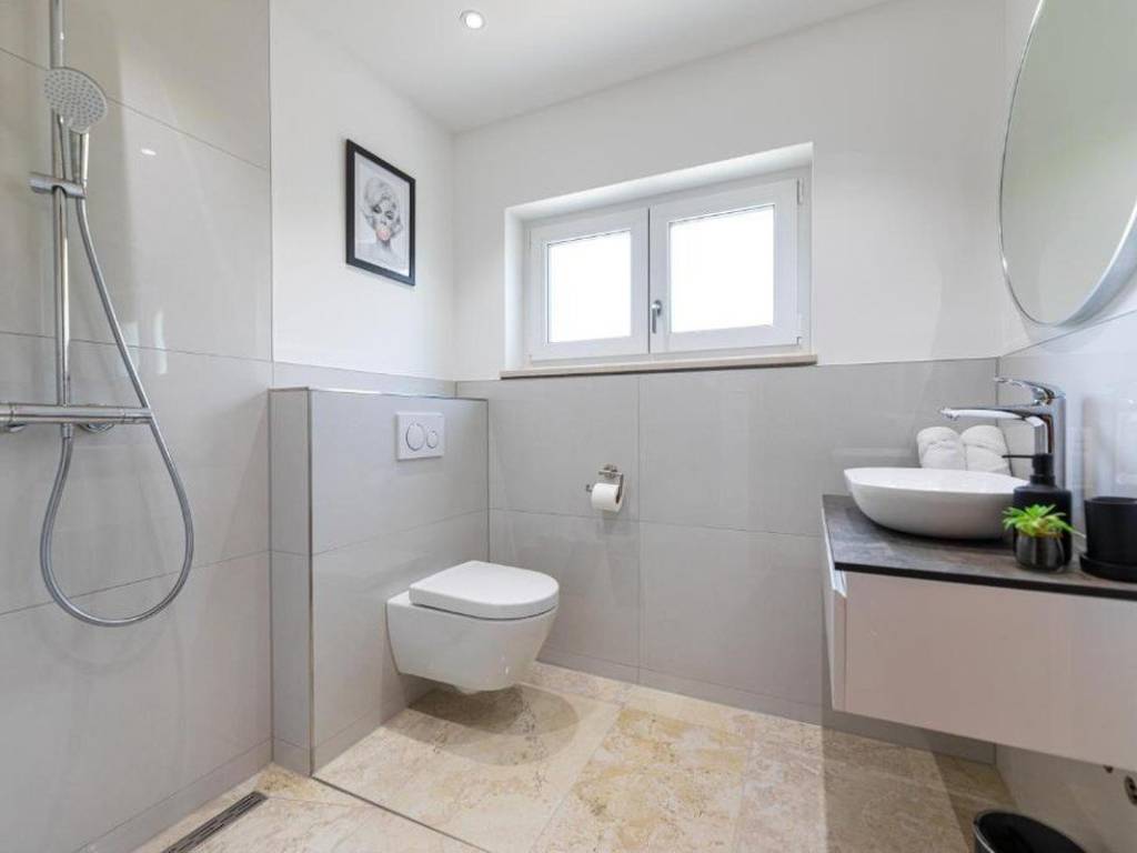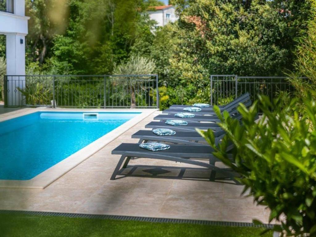 Im ersten Stock befinden sich ein Flur, drei Badezimmer, vier Schlafzimmer und eine Loggia. Das Anwesen verfügt über eine Garage und mehrere Parkplätze im Garten.