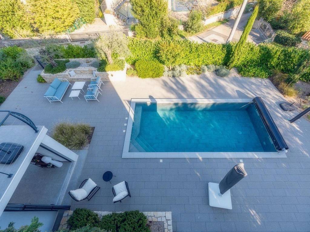 Ein freistehendes Haus mit 300 m Wohnfläche in der Bucht von Soline steht auf einem 644 m großen Grundstück zum Verkauf. Es verfügt über ein Untergeschoss, ein Hochparterre und ein Obergeschoss. Im Untergeschoss befinden sich ein Heizraum für die solare Warmwasserbereitung, ein Schlafzimmer mit Bad, ein Fitnessraum mit Sauna, ein WC und eine Sommerküche mit Zugang zum Garten und Pool. Das Hochparterre umfasst einen Eingangsbereich, ein WC, ein Schlafzimmer mit Bad, eine Küche mit Esszimmer und ein geräumiges Wohnzimmer mit Zugang zu einer überdachten Terrasse mit Meerblick. Im Obergeschoss befinden sich ein Abstellraum, ein Kleiderschrank sowie zwei Schlafzimmer mit eigenem Bad und eine Terrasse mit Blick ins Grüne.