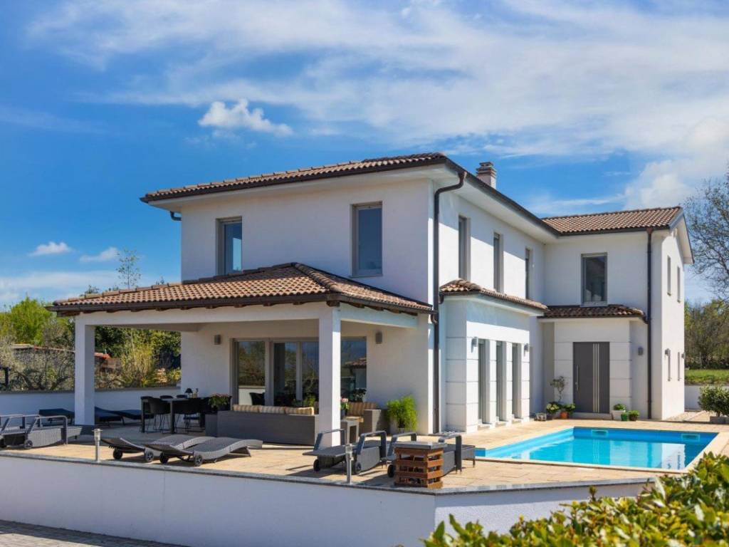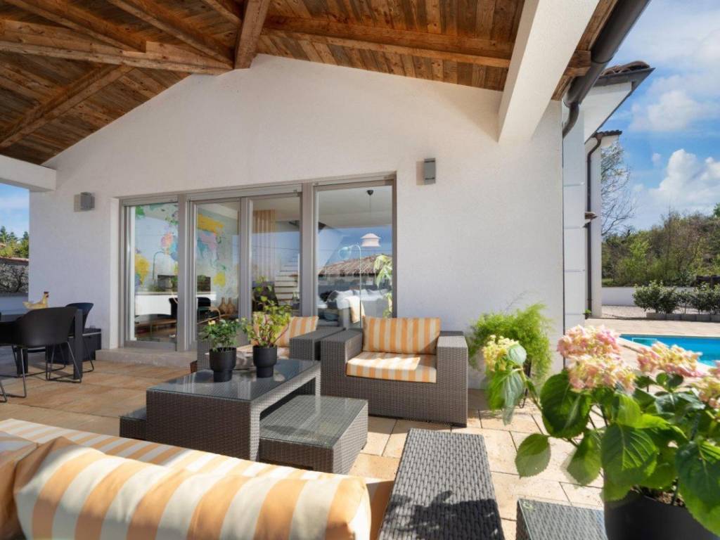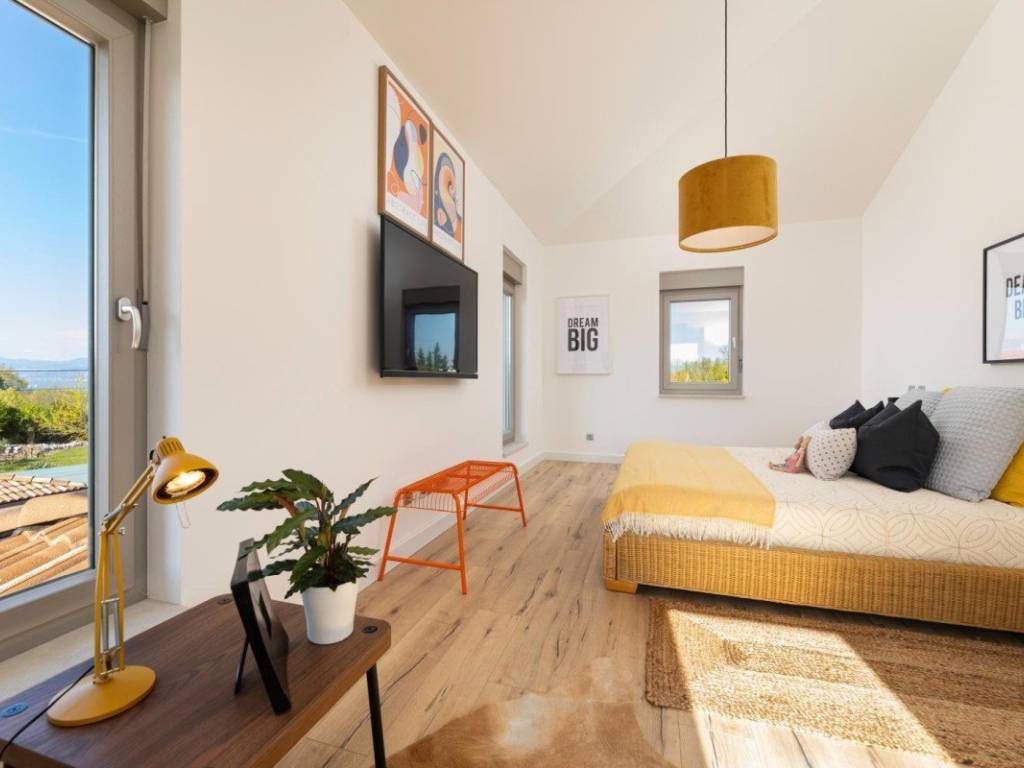 In ruhiger Lage nahe Malinska steht ein neues Einfamilienhaus mit modernem architektonischen Design zum Verkauf. Es befindet sich in wunderschöner, privater Lage, umgeben von viel Grün. Die Gesamtwohnfläche beträgt 284 m und verteilt sich auf das Erdgeschoss und das Obergeschoss.