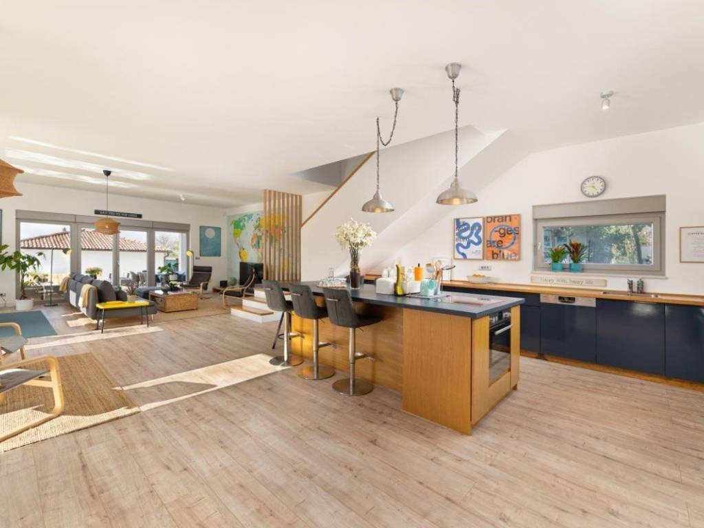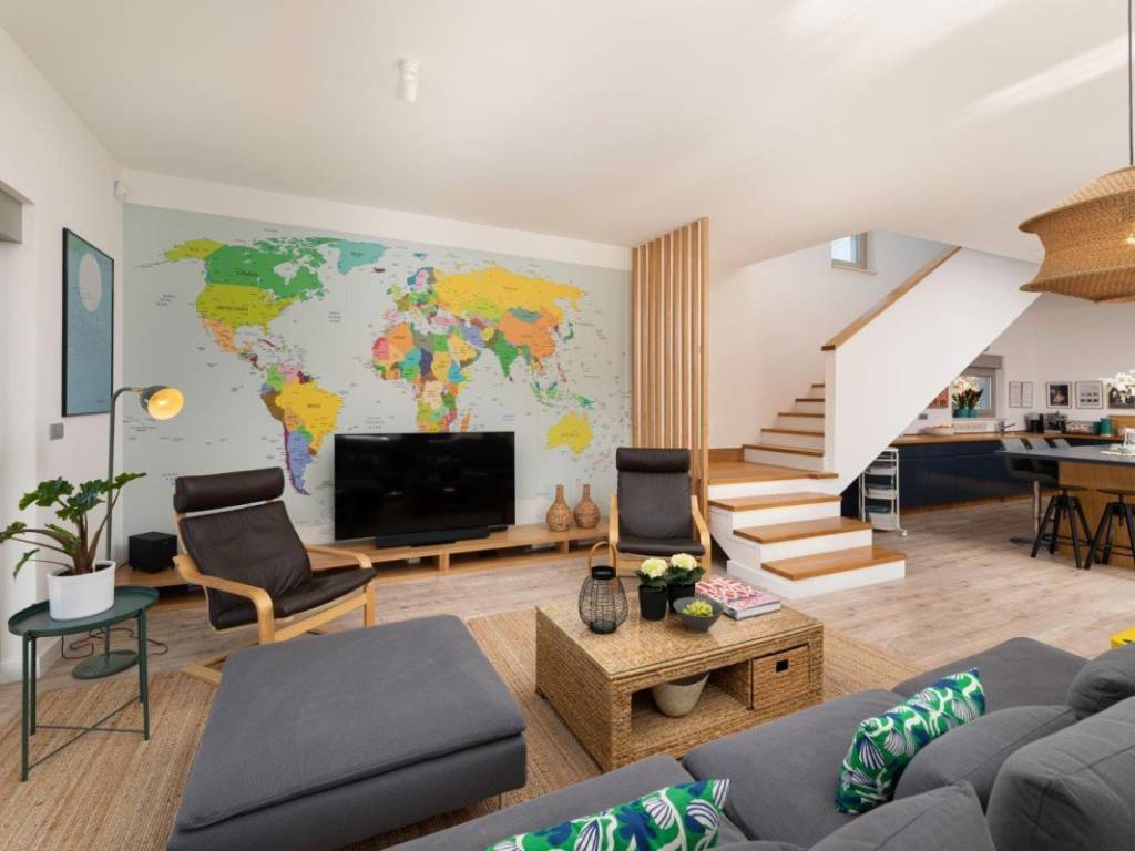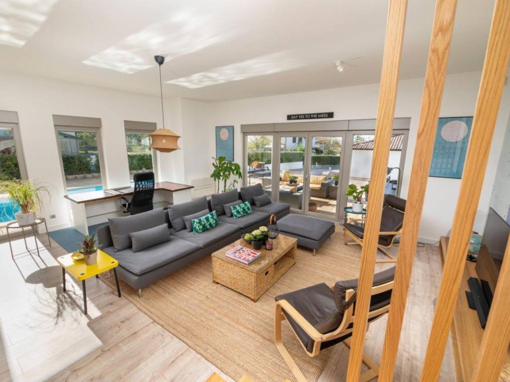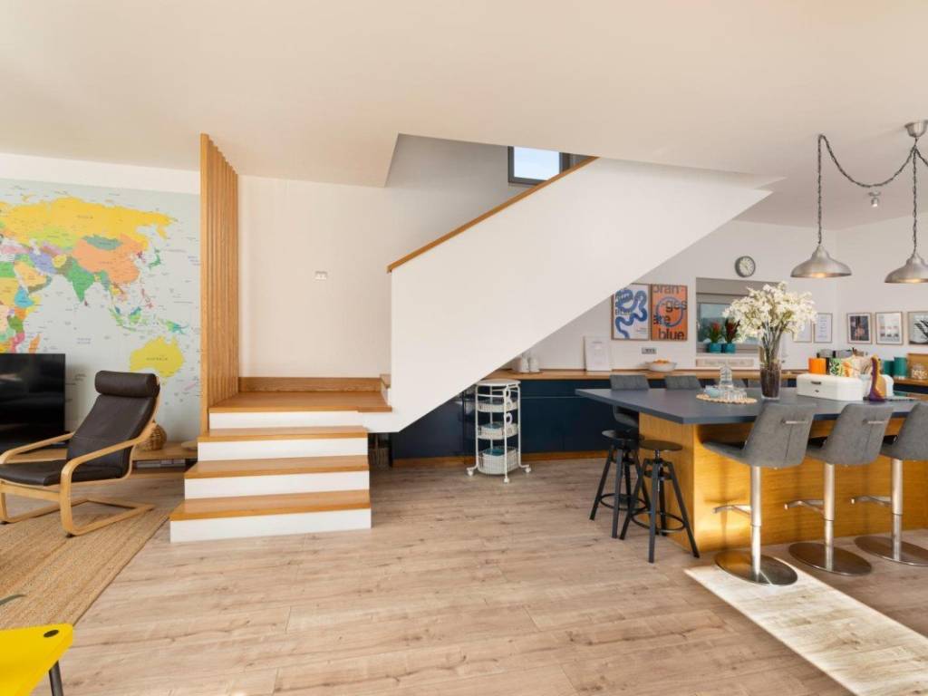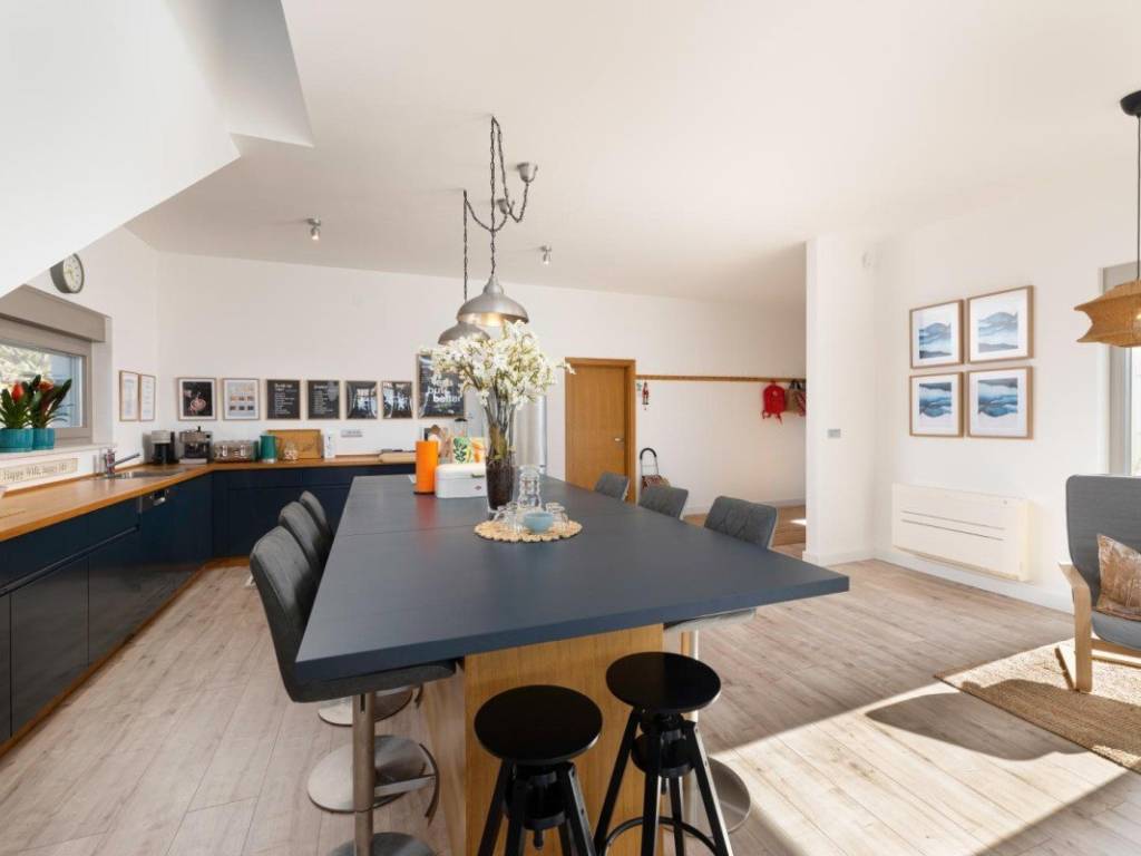 Das Erdgeschoss umfasst einen Eingangsbereich, ein Badezimmer, einen Hobbyraum und einen großzügigen Wohnbereich mit offenem Raumkonzept, der Küche, Esszimmer und Wohnzimmer verbindet und Zugang zu einer überdachten Terrasse und einem angelegten Garten bietet. Im Obergeschoss befinden sich drei Schlafzimmer und zwei Badezimmer, die sowohl für einen Familienurlaub als auch für die Vermietung an Touristen geeignet sind.