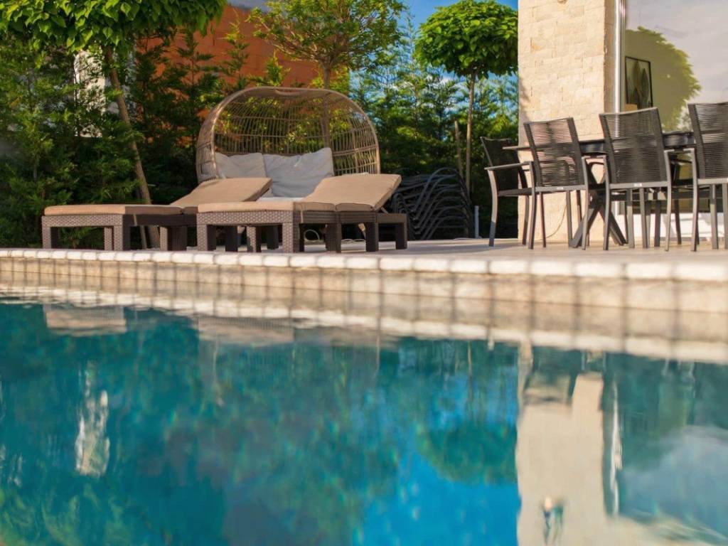 Auf dem Grundstück befindet sich ein beheizter Swimmingpool mit Liegewiese, von der aus man ebenfalls den Meerblick genießen kann.