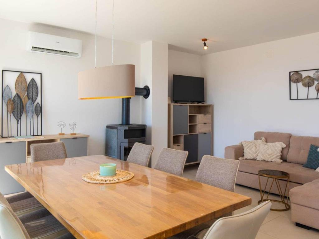 Das Haus ist komplett möbliert und mit modernen Annehmlichkeiten ausgestattet, darunter eine Klimaanlage, Fußbodenheizung und ein Holzofen, der zusätzlich zum Komfort beiträgt.