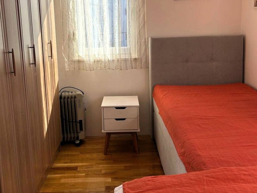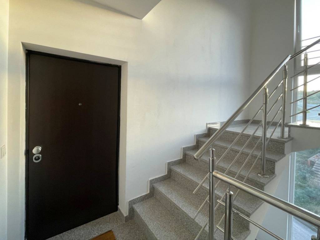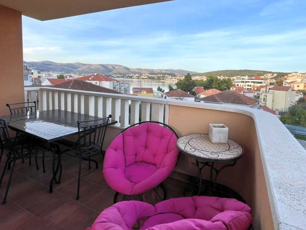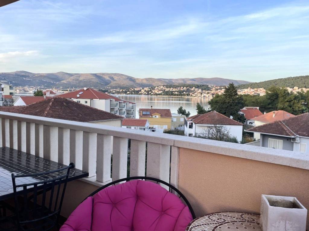 Apartment mit zwei Schlafzimmern und Meerblick auf der Westseite der Insel Čiovo. Es befindet sich im zweiten Stock eines kürzlich errichteten Wohngebäudes, das von ähnlichen Gebäuden umgeben ist.