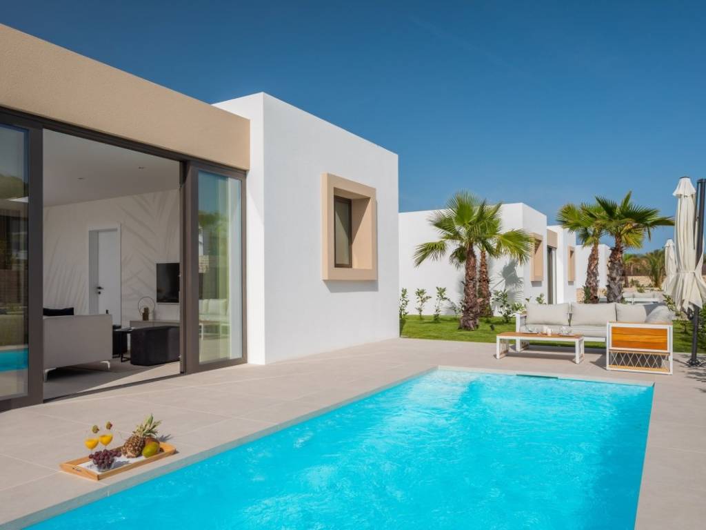 Das Anwesen besteht aus einer Eingangshalle, die zu einem Badezimmer führt, einem Schlafzimmer, einem Hauptschlafzimmer mit eigenem Badezimmer und einem offenen Raum, von dem aus Sie auf eine geräumige Terrasse mit Swimmingpool und privatem Sonnenbereich gelangen. Große Glaswände sorgen für viel Tageslicht und geben den Blick auf den angelegten Garten und die Terrasse frei. Die Ausrichtung des Grundstücks ist Ost-West, was den ganzen Tag über für viel Licht sorgt.