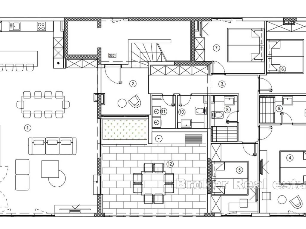 Die Wohnung besteht aus vier Schlafzimmern, von denen eines eine Master-Suite ist, einem gemeinsamen Badezimmer und einer Toilette, Wohnzimmer, Küche und Esszimmer mit Zugang zur Loggia. Die Wohnung ist so konzipiert, dass sich alle Gemeinschaftsräume auf der Südseite befinden und jeweils einen Blick auf das Meer und die begrünte Promenade bieten, während die Wohnung durch Glaswände den ganzen Tag über sonnig ist.