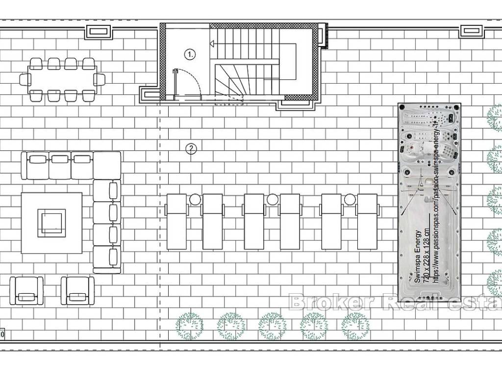 Eine Treppe führt zu einer privaten Dachterrasse, die sich über die gesamte Etage erstreckt und Platz für verschiedene zusätzliche Annehmlichkeiten bietet. Die Terrasse verfügt über ein Sonnendeck, eine Sommerküche im Freien und einen Sitzbereich.