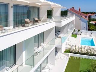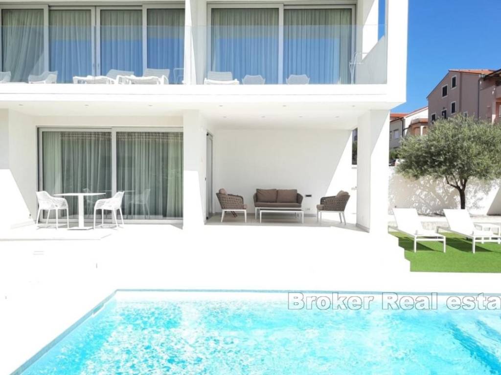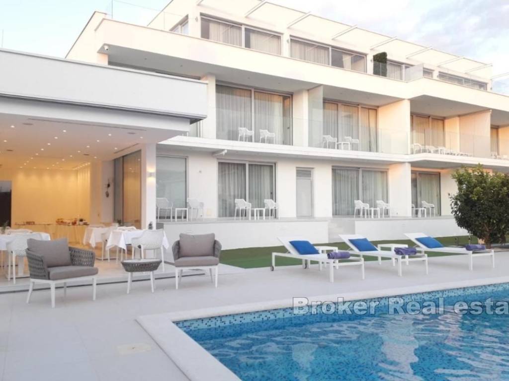Zum Verkauf steht ein modernes und attraktives Hotel in bester Lage in Zadar. Das 2017 erbaute Hotel bietet eine perfekte Investitionsmöglichkeit. Es erstreckt sich über drei Etagen mit einer Innenwohnfläche von 500 m, die Gesamtfläche inklusive Terrassen und offenen Gebäudeteilen beträgt 1.009 m. Im Erdgeschoss befinden sich ein Empfangsbereich und ein Restaurant mit Innen- und Außensitzplätzen. Im Innenhof gibt es einen Gemeinschaftspool für Gäste sowie eine Sonnenterrasse. Zusätzlich gibt es einen privaten Pool, der zu einer Wohnung im Erdgeschoss gehört.
