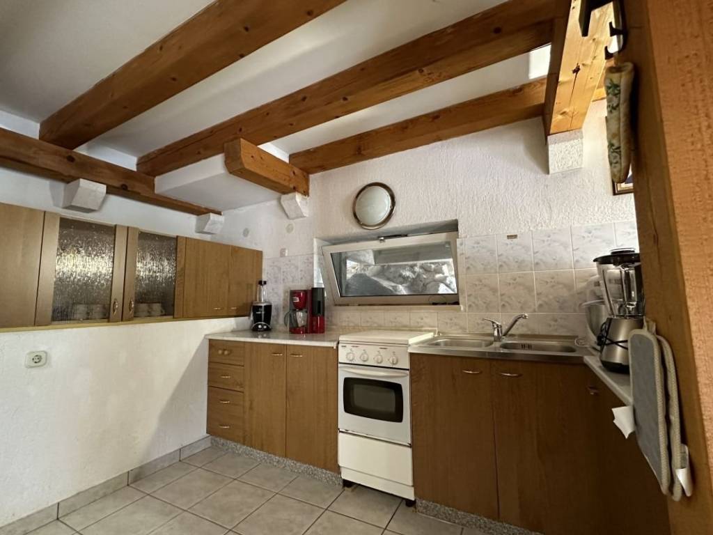 Das erste Haus ist aus Stein gebaut und verfügt im Erdgeschoss über einen geräumigen Wohn- und Essbereich sowie eine voll ausgestattete Küche und ein Badezimmer. Im ersten Stock gibt es ein Doppelzimmer mit Toilette und zwei Einzelzimmer.