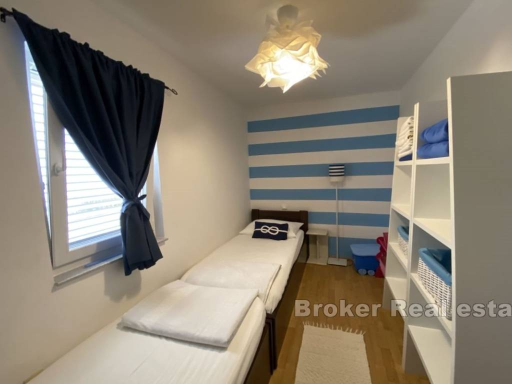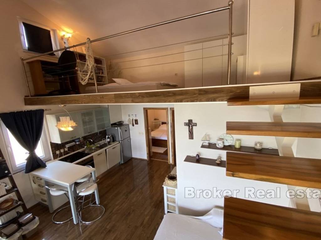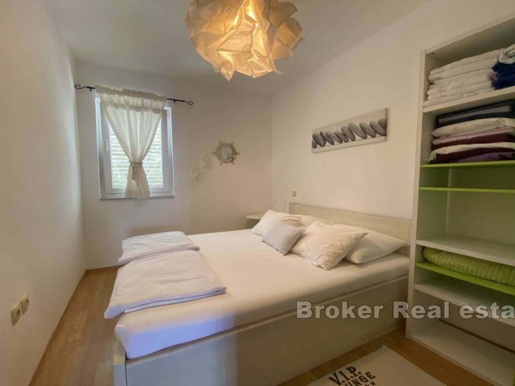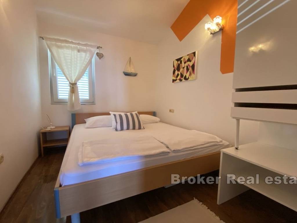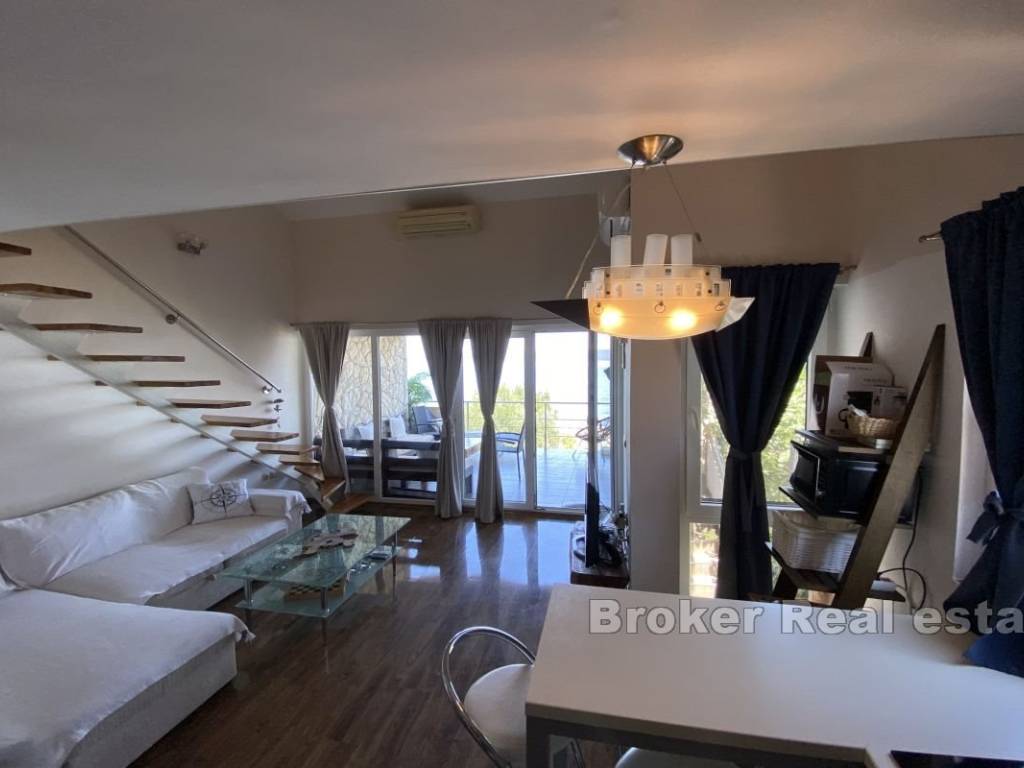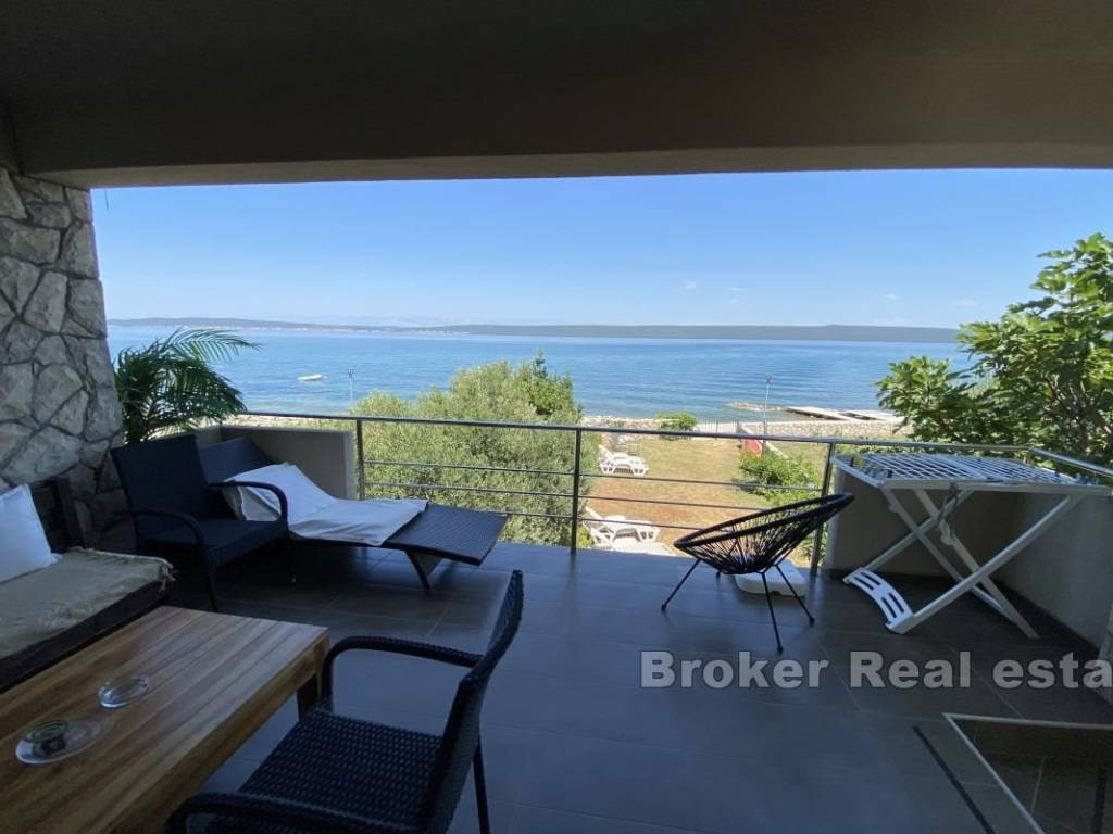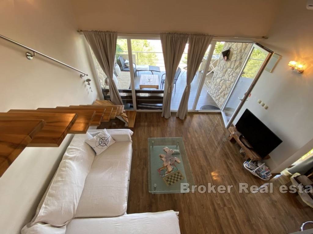 Der Zugang zur Wohnung im ersten Stock erfolgt über eine Außentreppe. Die Wohnung besteht aus zwei Zimmern, einer Küche, einem Esszimmer, einem Wohnzimmer und einem Badezimmer sowie einer zusätzlichen Galerie mit Blick auf das Meer. Die Terrasse im Apartment bietet einen freien Blick auf den Strand und das Meer.