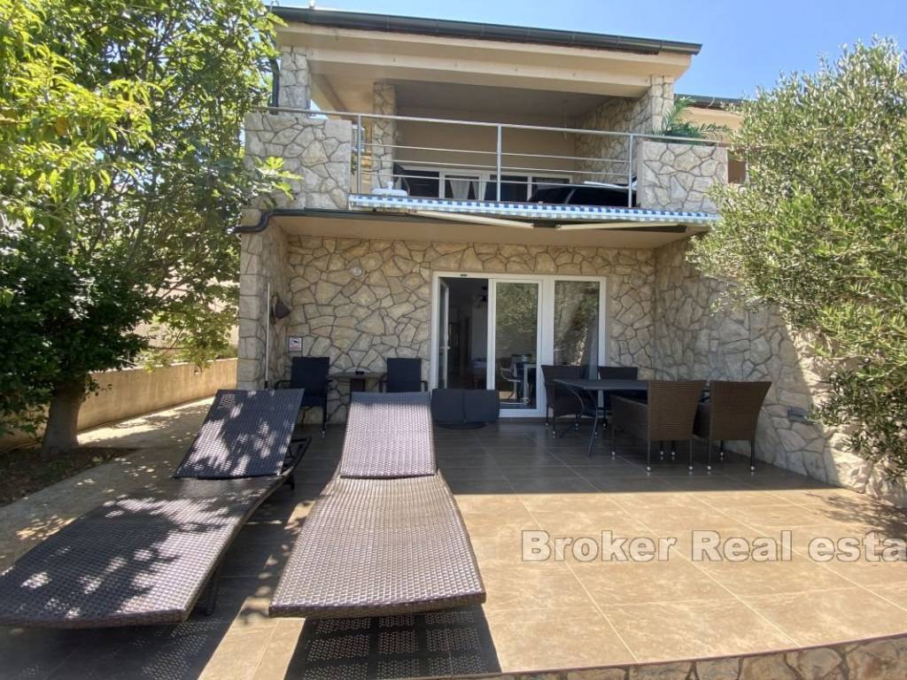 Im Erdgeschoss befindet sich eine Zweizimmerwohnung mit Küche, Esszimmer, Wohnzimmer, Bad und separater Toilette. Von der Wohnung aus gelangt man auf eine Terrasse, die ausreichend Platz zum geselligen Beisammensein und Entspannen mit Blick auf das Meer bietet.